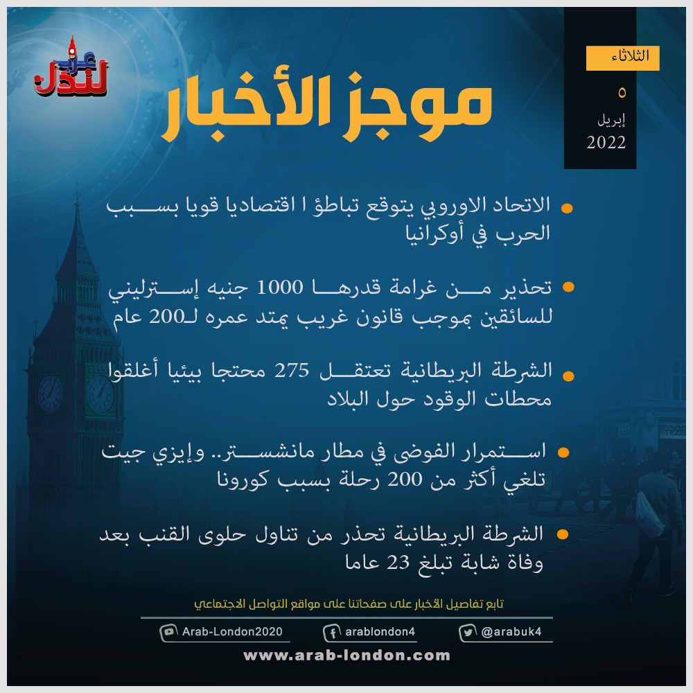 الرئيسية أخبار موجز لأهم أخبار بريطانيا الثلاثاء 5-4-2022 أخبار موجز لأهم أخبار بريطانيا الثلاثاء 5-4-2022 2022-04-05 عرب لندن - لندن إليكم موجز لأهم أخبار بريطانيا الثلاثاء 5-4-2022 السابق الناشط الفلسطيني الفرنسي صلاح حموري يقاضي بيغاسوس في فرنسا التالي استمرار التحقيقات في وفاة ضحية انتقام إباحي بعد سقوطها من شرفة منزلها في لندن تابعوا آخر أخبار عرب لندن عبر Google News الاكثر قراءة برنامج تجريبي: 40 ألف جنيه إسترليني لتشجيع عائلات طالبي اللجوء المرفوضة على مغادرة بريطانيا 2026-03-05 بعد العثور على 600 قطعة سلاح.. إدانة بريطاني مهووس بالنازية بتهم إرهابية 2026-03-06 عاجل/ اعتقال 10 أشخاص بينهم بريطانيون للاشتباه في تجسسهم لصالح إيران في لندن 2026-03-06 اعتقال زوج نائبة بريطانية واثنين آخرين للاشتباه بالتجسس لصالح الصين 2026-03-06 تحقيق يكشف تورط 22 متهماً في مؤامرة طرود مفخخة استهدفت بريطانيا وأوروبا بدعم روسي 2026-03-06 بريطانيا تقرّ إجراءات مشددة: السماح لآلاف اللاجئين بالعمل مقابل رفع الدعم الحكومي 2026-03-05 مقالات ذات صلة رئيس وزراء بريطانيا الأسبق ينتقد ستارمر: "كان يجب دعم ترامب منذ البداية" في إيران 2026-03-09 عاجل| ستارمر يحذر من تداعيات الصراع مع إيران على الاقتصاد البريطاني 2026-03-09 موجز أخبار بريطانيا من منصة عرب لندن: الاثنين: 9 مارس/آذار 2026 2026-03-09 بريطانيا: تفشي الحصبة قد يفرض إبعاد الأطفال غير الملقحين عن المدارس 2026-03-09 فيديو/ بريطانيا في دقيقة أخبار جيدة: تعديلات قوانين الهجرة والإقامة الدائمة لن تطبق بأثر رجعي!! 2026-03-09