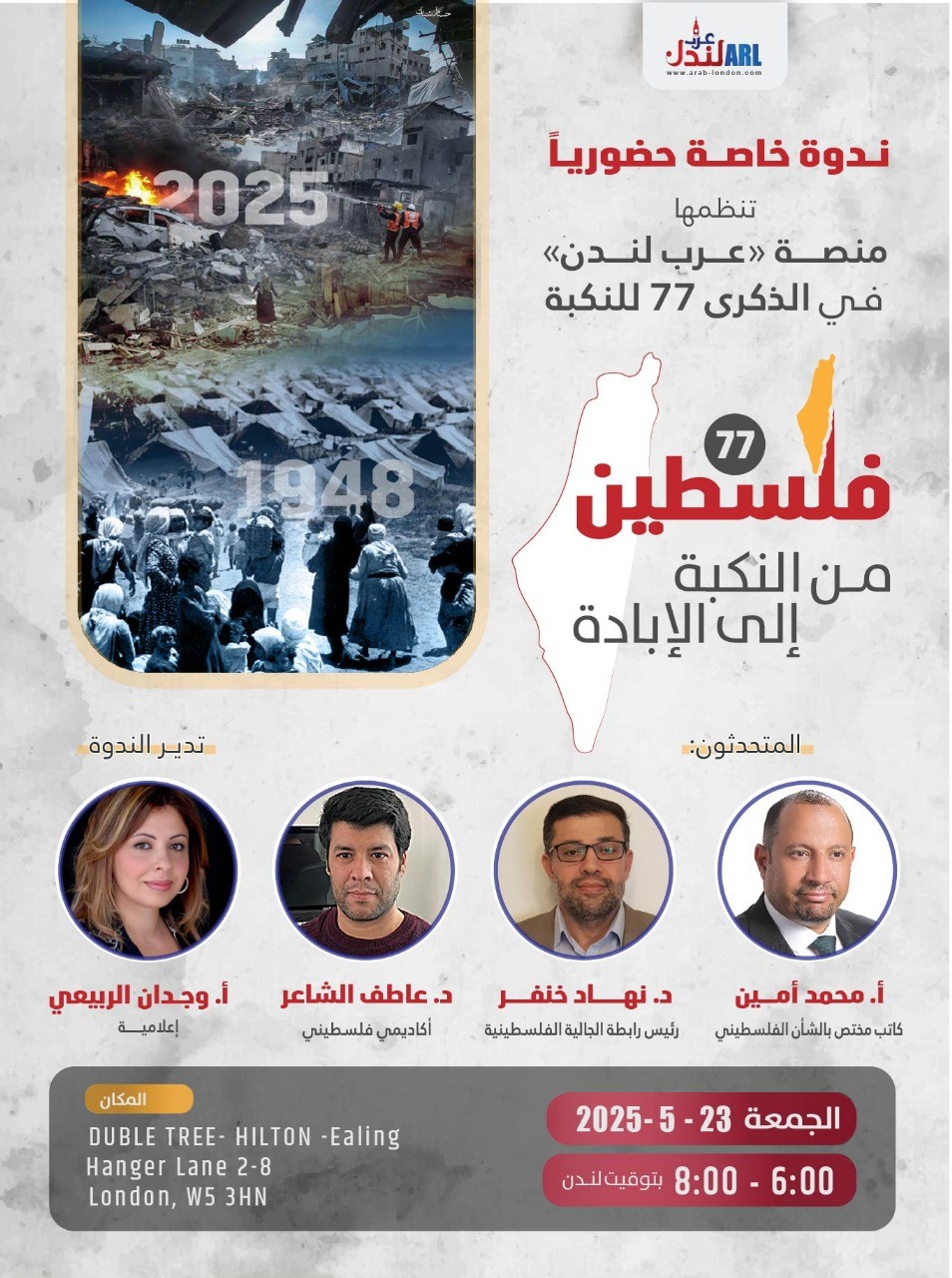 تنظم منصة عرب لندن ندوة حضورية خاصة بمناسبة الذكرى 77 للنكبة، تحت عنوان "فلسطين: من النكبة إلى الإبادة"، وذلك يوم الجمعة الموافق 23 مايو 2025، من الساعة السادسة وحتى الثامنة مساءً بتوقيت لندن.