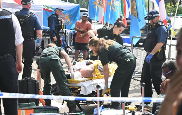 وأفادت الشرطة أنها تلقت بلاغًا قبيل الساعة العاشرة صباحًا بشأن مشادة كلامية تطورت إلى اعتداء جسدي، خلال احتجاج شارك فيه نحو 40 متظاهرًا من المؤيدين والمعارضين للنظام الإيراني، بعضهم كان يحمل أعلامًا إسرائيلية وأخرى مختلفة، وفقًا لشهود عيان.