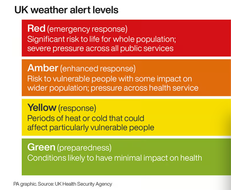 كما أُصدر تحذير صحي إضافي باللون الأصفر ليشمل يوركشاير وهامبر وويست ميدلاندز، وسط توقعات بأن تؤثر الحرارة المرتفعة على كفاءة خدمات الرعاية الصحية والاجتماعية في تلك المناطق.