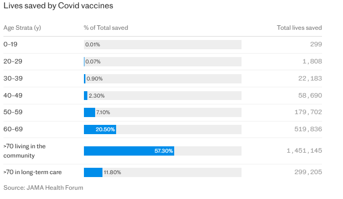 وأوضحت الدراسة أن نحو 90% من الأرواح التي أُنقذت كانت لأشخاص تزيد أعمارهم عن 60 عامًا، بينما أنقذت اللقاحات 299 شخصًا فقط دون سن العشرين، و1,808 في الفئة العمرية بين 20 و30 عامًا على مستوى العالم.