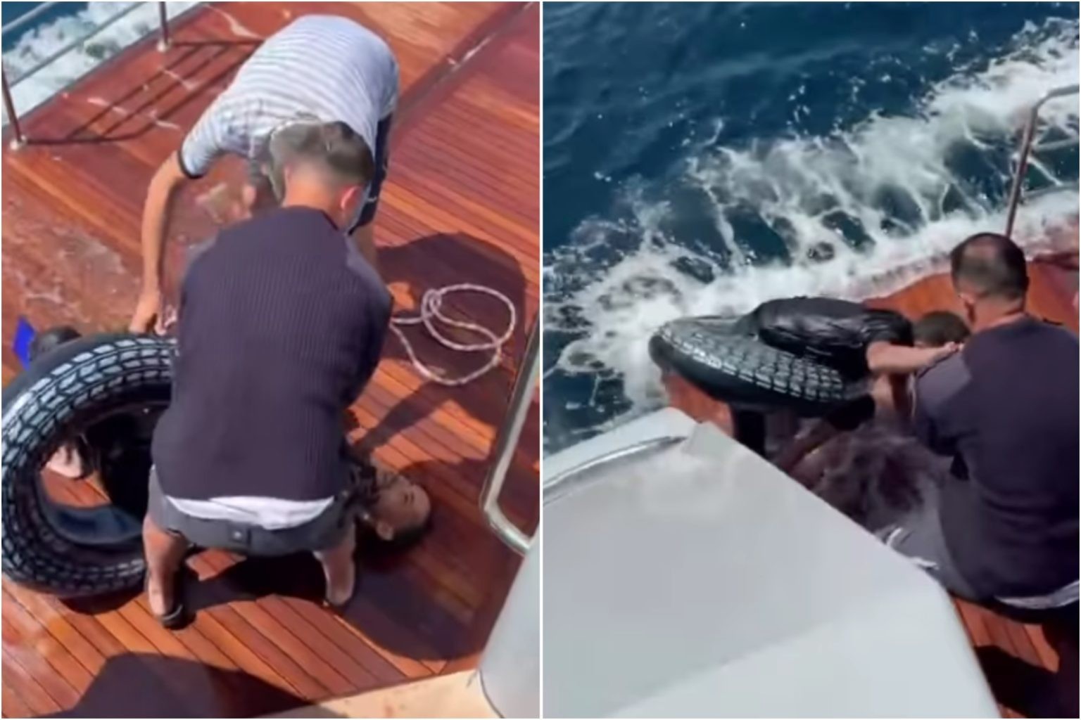 ورصدت الكاميرا لحظة إنقاذ الشاب، حيث ألقوا له حبلاً ليسحبه باتجاه اليخت، وظهر في الفيديو وهو يسبح بصعوبة نحوهم، بحسب ما نقلته "الغارديان".