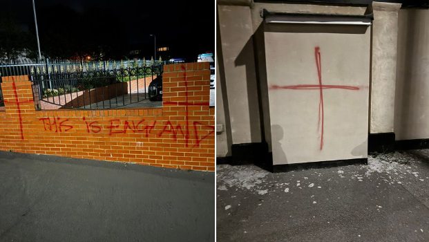 أعلنت شرطة إسيكس أنها تبحث عن رجلين يُشتبه في ضلوعهما بتخريب مركز إسلامي في مقاطعة إسيكس، بعد أن قاما برسم صلبان القديس جورج وكتابة عبارات عنصرية على جدران المبنى.