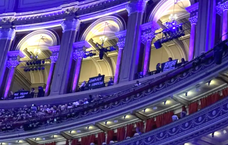 وبحسب ما ورد في “التلغراف” The Telegraph رفع أعضاء من منظمة "فنانون يهود من أجل فلسطين" Jewish Artists for Palestine لافتات سوداء كتب عليها بخط اليد عبارات مثل "التواطؤ في الإبادة الجماعية" و"فنانون يهود من أجل فلسطين"، مرددين هتافات تتهم الأوركسترا بـ"الدماء على الأيدي". وقد تسبب الاحتجاج في تعطيل العرض لأكثر من عشر دقائق، قبل أن يتدخل الأمن لإخراج المتظاهرين من القاعة.