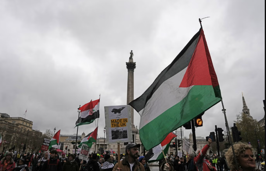 وفي لندن، جذب احتجاج منفصل نظّمه ائتلاف فلسطين نحو 100 ألف شخص، وفق تقديرات المنظمين. وأعلنت الشرطة اعتقال شخص للاشتباه في الشغب، واحتجاز أربعة آخرين للاشتباه في ارتكاب جرائم بموجب قانون النظام العام.