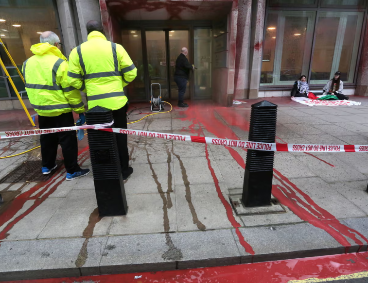 من جهتها، قالت شرطة سكوتلاند يارد إنها تلقت بلاغًا في الساعة 7:35 صباح الجمعة يفيد بقيام متظاهرين برش الطلاء على واجهة المبنى، مؤكدة اعتقال شخصين للاشتباه في ارتكابهما جريمة تخريب.