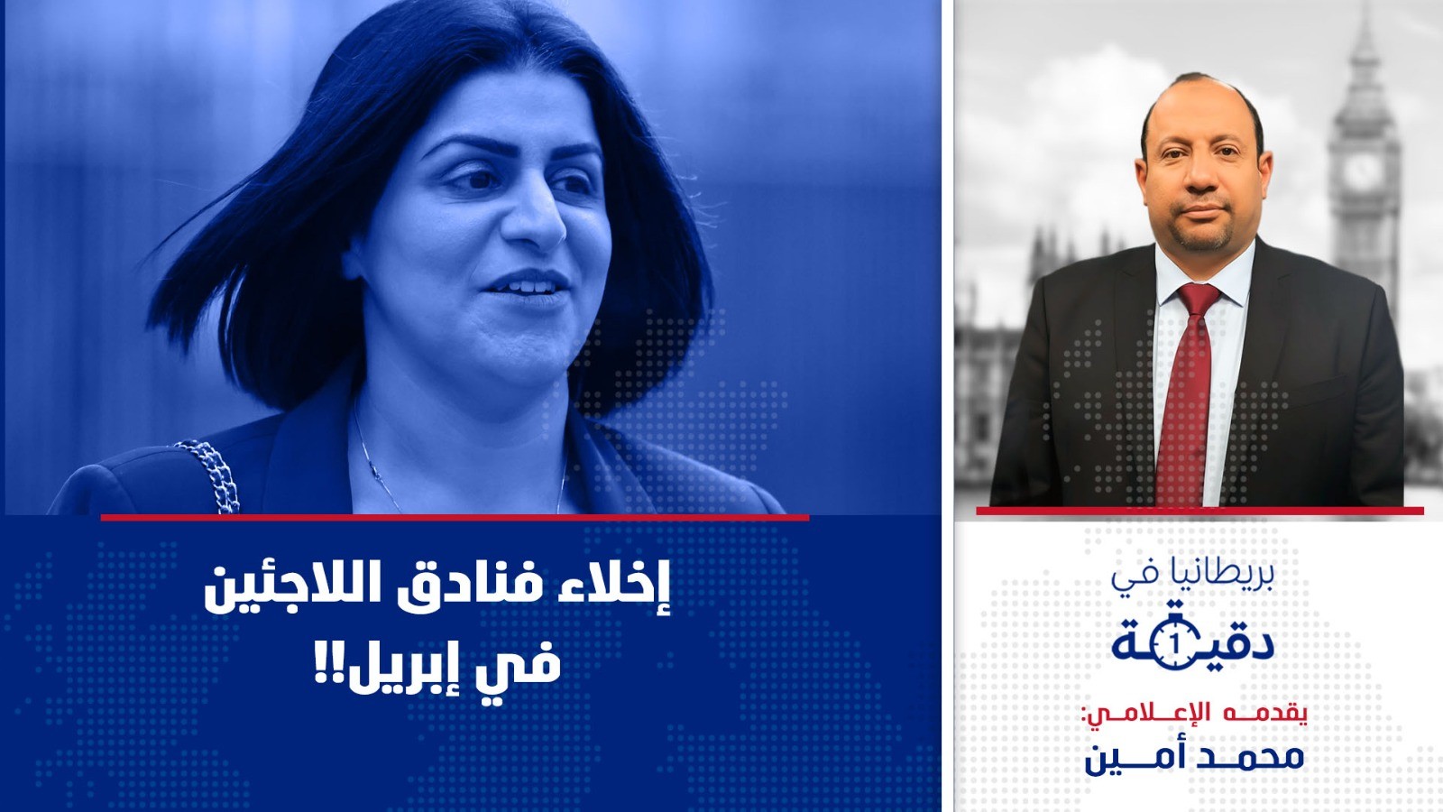 خصّص الإعلامي محمد أمين حلقة برنامجه "بريطانيا في دقيقة" للحديث عن خطة وزارة الداخلية البريطانية لبدء إخلاء طالبي اللجوء المقيمين في الفنادق هذا الربيع. تأتي هذه الخطوة ضمن جهود الحكومة لتقليص الدعم المقدم لهم وإغلاق المزيد من مرافق الإقامة المؤقتة.
