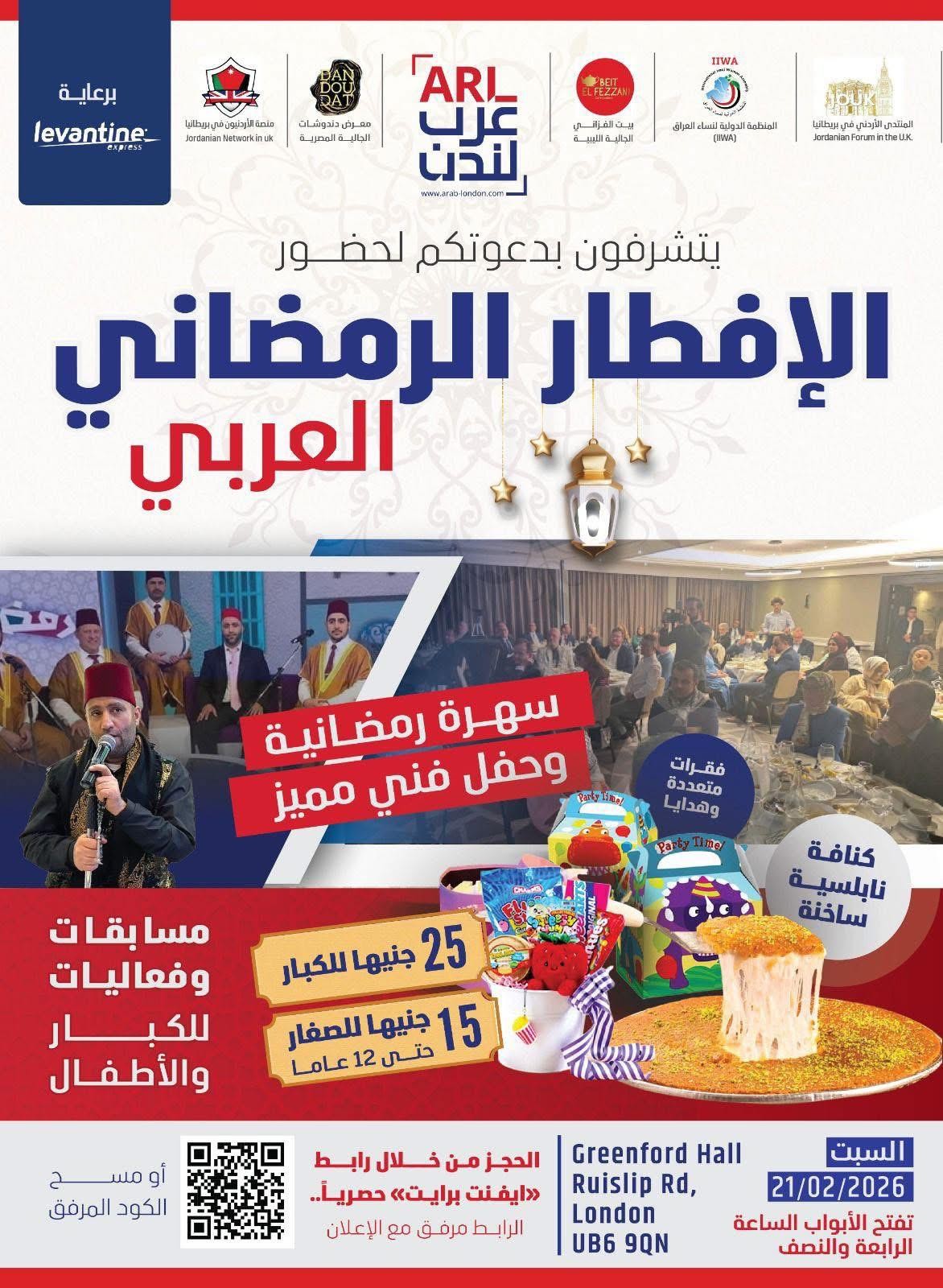 أعلنت شركة Levantine Express عن تنظيم سحب خاص لعملائها بمناسبة حلول شهر رمضان المبارك، يتيح لهم الفوز بتذاكر حضور الإفطار الرمضاني العربي المقرر يوم السبت 21 فبراير 2026، إلى جانب جوائز نقدية سيتم السحب عليها خلال الحفل.
