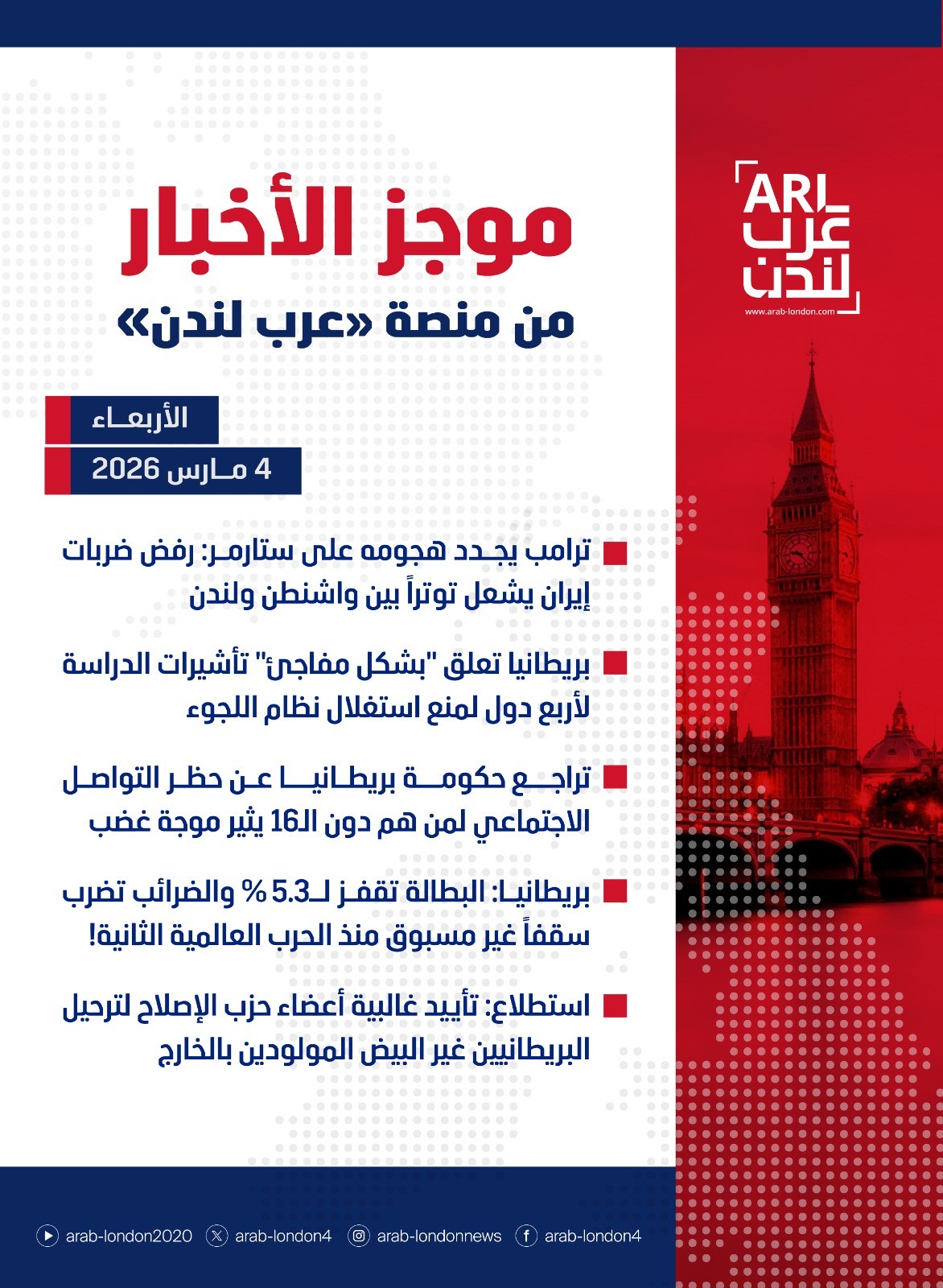 الرئيسية أخبار موجز أخبار بريطانيا من منصة عرب لندن: الأربعاء : 4 مارس/آذار 2026 أخبار موجز أخبار بريطانيا من منصة عرب لندن: الأربعاء : 4 مارس/آذار 2026 2026-03-04 🔴ترامب يجدد هجومه على ستارمر: رفض ضربات إيران يشعل توتراً بين واشنطن ولندن 🔴بريطانيا تعلق "بشكل مفاجئ" تأشيرات الدراسة لأربع دول لمنع استغلال نظام اللجوء 🔴تراجع حكومة بريطانيا عن حظر التواصل الاجتماعي لمن هم دون الـ16 يثير موجة غضب 🔴بريطانيا: البطالة تقفز لـ 5.3% والضرائب تضرب سقفاً غير مسبوق منذ الحرب العالمية الثانية! 🔴استطلاع: تأييد غالبية أعضاء حزب الإصلاح لترحيل البريطانيين غير البيض المولودين بالخارج السابق مكتب مسؤولية الميزانية يتوقع مغادرة 50 ألف بريطاني إضافي سنوياً حتى 2030 التالي تراجع حكومة بريطانيا عن حظر التواصل الاجتماعي لمن هم دون الـ16 يثير موجة غضب تابعوا آخر أخبار عرب لندن عبر Google News الاكثر قراءة اعتقال زوج نائبة بريطانية واثنين آخرين للاشتباه بالتجسس لصالح الصين 2026-03-06 برنامج تجريبي: 40 ألف جنيه إسترليني لتشجيع عائلات طالبي اللجوء المرفوضة على مغادرة بريطانيا 2026-03-05 تحقيق يكشف تورط 22 متهماً في مؤامرة طرود مفخخة استهدفت بريطانيا وأوروبا بدعم روسي 2026-03-06 بريطانيا تقرّ إجراءات مشددة: السماح لآلاف اللاجئين بالعمل مقابل رفع الدعم الحكومي 2026-03-05 بعد العثور على 600 قطعة سلاح.. إدانة بريطاني مهووس بالنازية بتهم إرهابية 2026-03-06 عاجل/ اعتقال 10 أشخاص بينهم بريطانيون للاشتباه في تجسسهم لصالح إيران في لندن 2026-03-06 مقالات ذات صلة إجلاء أكثر من 100 شخص بعد انهيار رافعة في غرب لندن 2026-03-06 استجواب ثلاث مشتبهات في تحقيقات الاعتداءات الجنسية المرتبطة بمحمد الفايد 2026-03-06 اتهامات لوزيرة الداخلية بتقليد سياسات ترامب المتشددة تجاه اللاجئين 2026-03-06 تحقيق يكشف تورط 22 متهماً في مؤامرة طرود مفخخة استهدفت بريطانيا وأوروبا بدعم روسي 2026-03-06 وزير أيرلندي يندد بالإساءة لعمال محطات الوقود بسبب ارتفاع الأسعار 2026-03-06