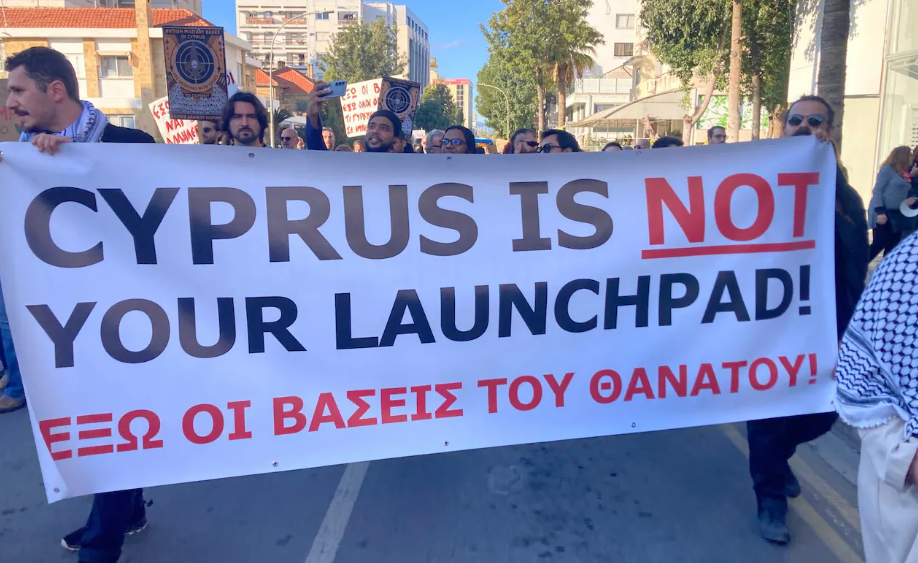وبحسب موقع صحيفة “التلغراف” The Telegraph انطلق نحو 300 متظاهر من مقر نقابي في وسط المدينة باتجاه القصر الرئاسي وهم يهتفون: "قولوها بصوت عالٍ وواضح، القواعد البريطانية ارحلوا من هنا!"، رافعين لافتات كتب عليها "قبرص ليست منصة لكم" و"أوقفوا الحرب".