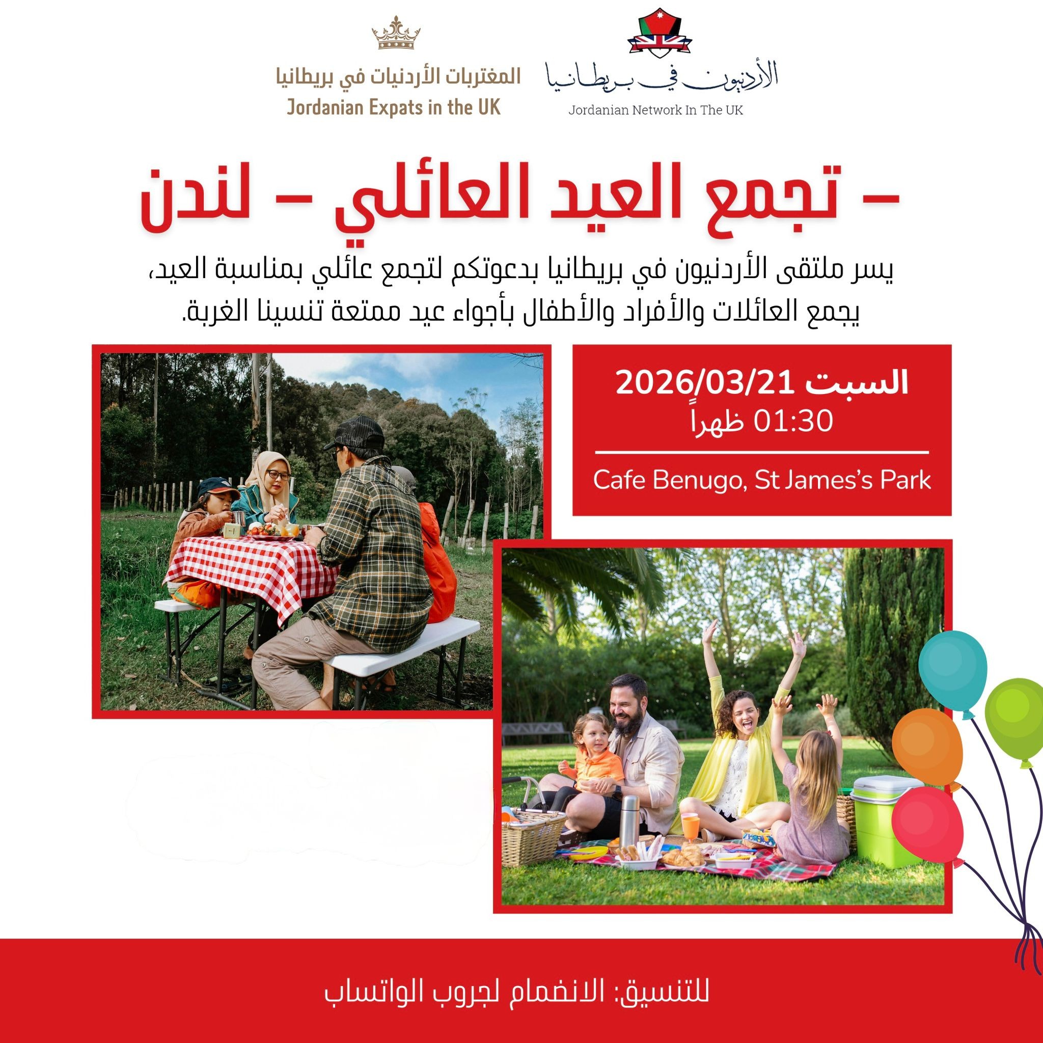 أعلن ملتقى الأردنيين في بريطانيا عن تنظيم التجمع العائلي السنوي بمناسبة عيد الفطر، يوم السبت 21 آذار في قلب العاصمة البريطانية لندن، بهدف جمع العائلات والأفراد والأطفال في أجواء احتفالية دافئة تعزز التواصل وتخفف من شعور الغربة.