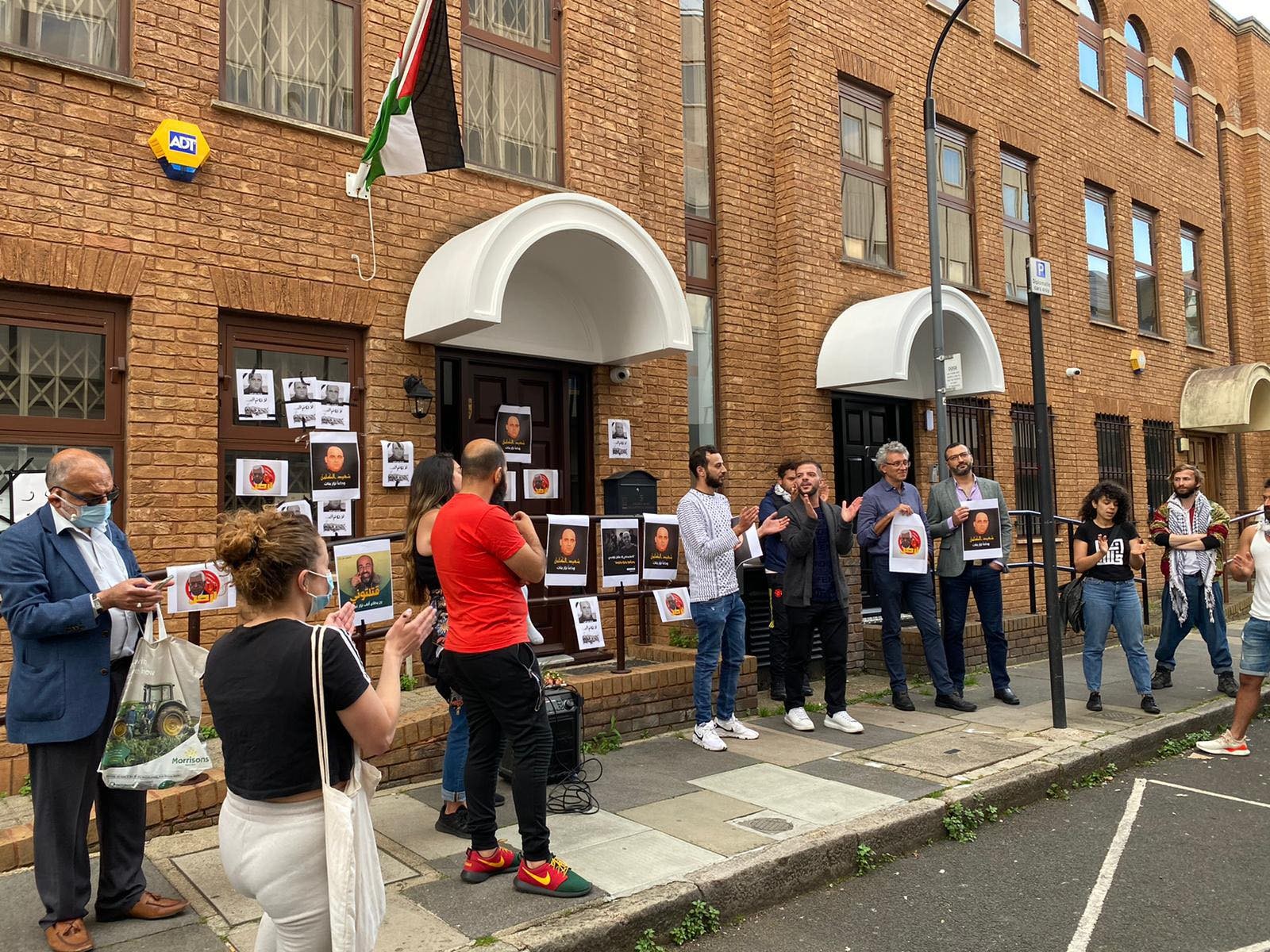 نظم نشطاء فلسطينيون في بريطانيا وقفة احتجاجية أمام سفارة السلطة الفلسطينية في لندن، للتنديد باغتيال الناشط السياسي الفلسطيني "نزار بنات" اليوم الجمعة 25 يونيو.