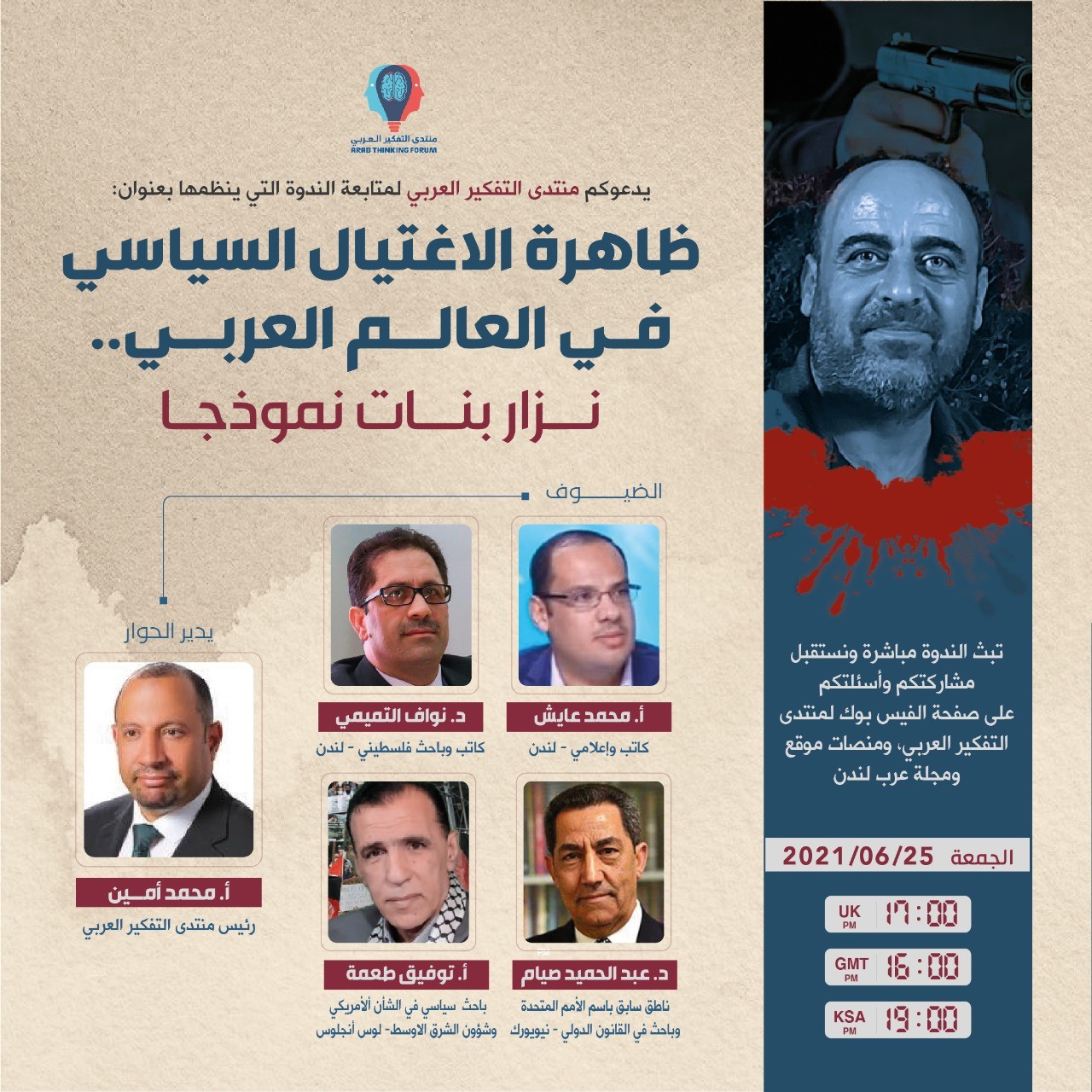 نظم منتدى التفكير العربي يوم أمس الجمعة 25 يونيو ندوة بعنوان "ظاهرة الاغتيال السياسي في العالم العربي.. نزار بنات نموذجا". وأدار الندوة رئيس المنتدى الكاتب والإعلامي الأستاذ محمد أمين. وبثت الندوة مباشرة على صفحة الفيسبوك لمنتدى التفكير العربي، ومنصات موقع "عرب لندن" على السوشيال ميديا.