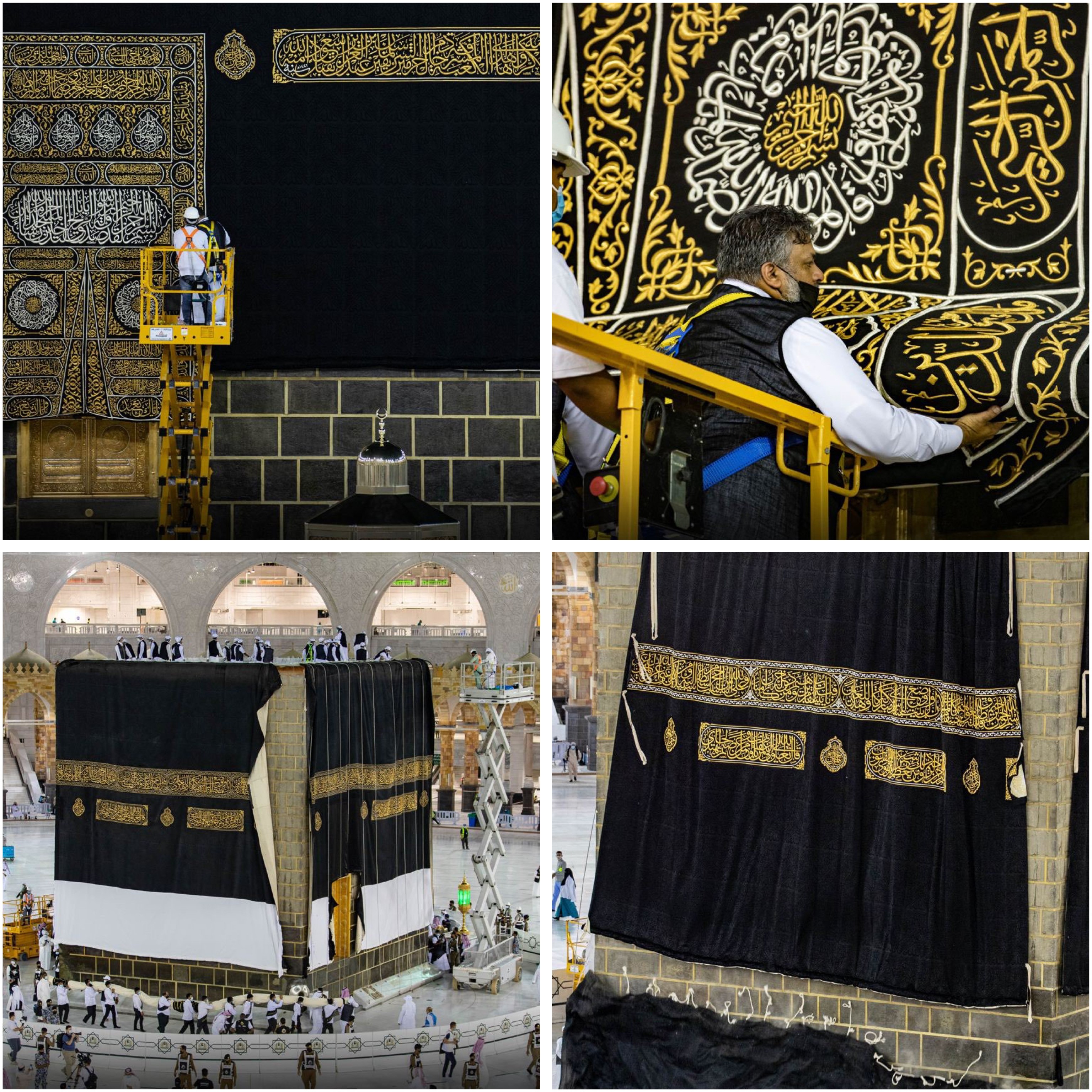 وأشارت الرئاسة إلى أن عملية استبدال الكسوة تمت بواسطة فريق عمل على تفكيك الكسوة القديمة وتركيب الجديدة، ومن ثم تثبيتها في أركان الكعبة وسطحها.