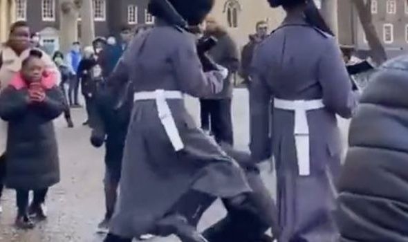 انتشر مقطع فيديو عبر مواقع التواصل الاجتماعي، يوثق لحظة قيام حارس ملكي بالمشي قُدما بالرغم من اصطدامه بطفل وطرحه أرضا وذلك خلال مسيرة دورية في برج لندن.