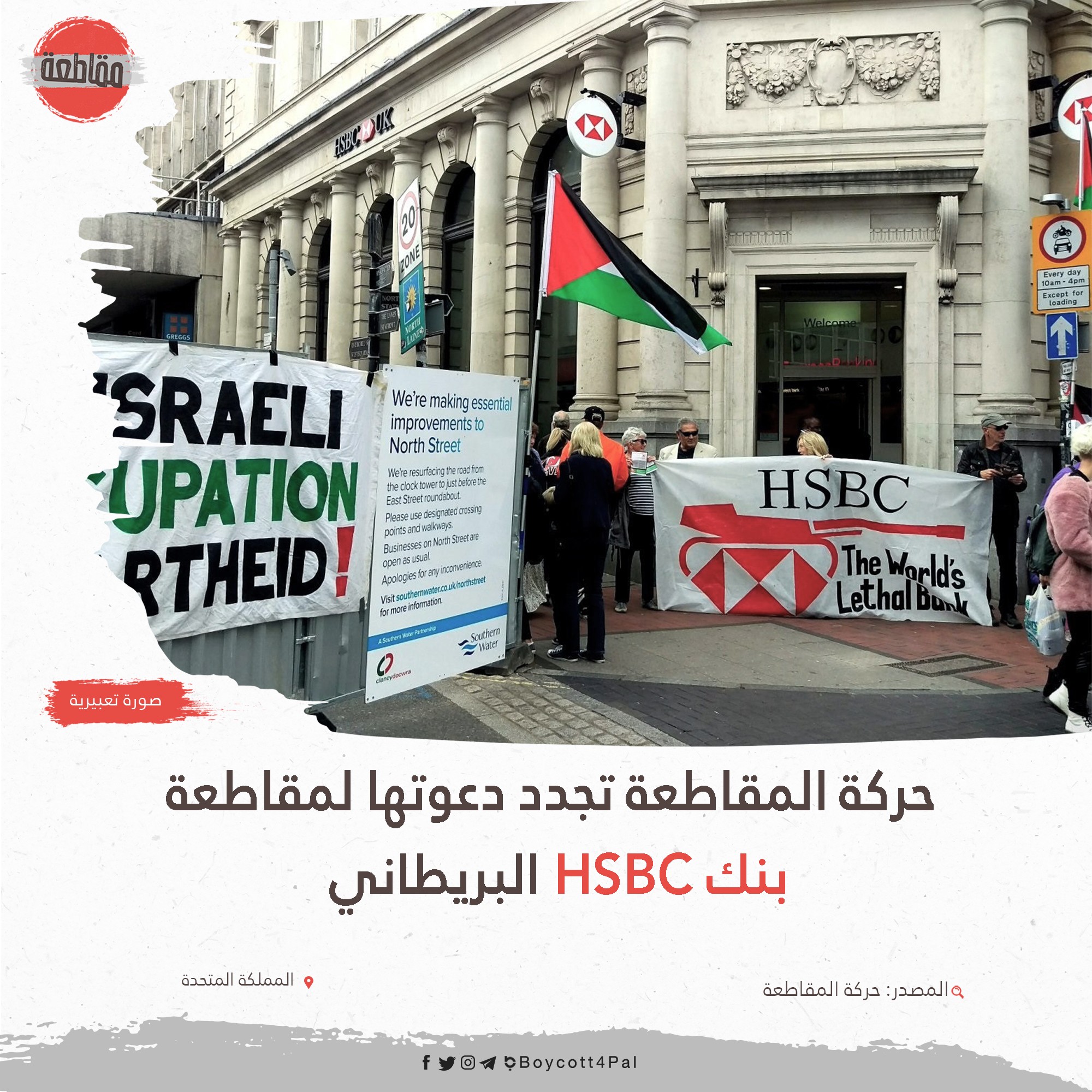 جددت حركة المقاطعة دعوتها لمقاطعة بنك HSBC الاستثماري البريطاني، بسبب استثمار البنك نحو 830 مليون جنيه استرليني، في شركات الأسلحة الإسرائيلية، الضالعة في انتهاكات ترقى لمستوى جرائم حرب ضد الفلسطينيين.