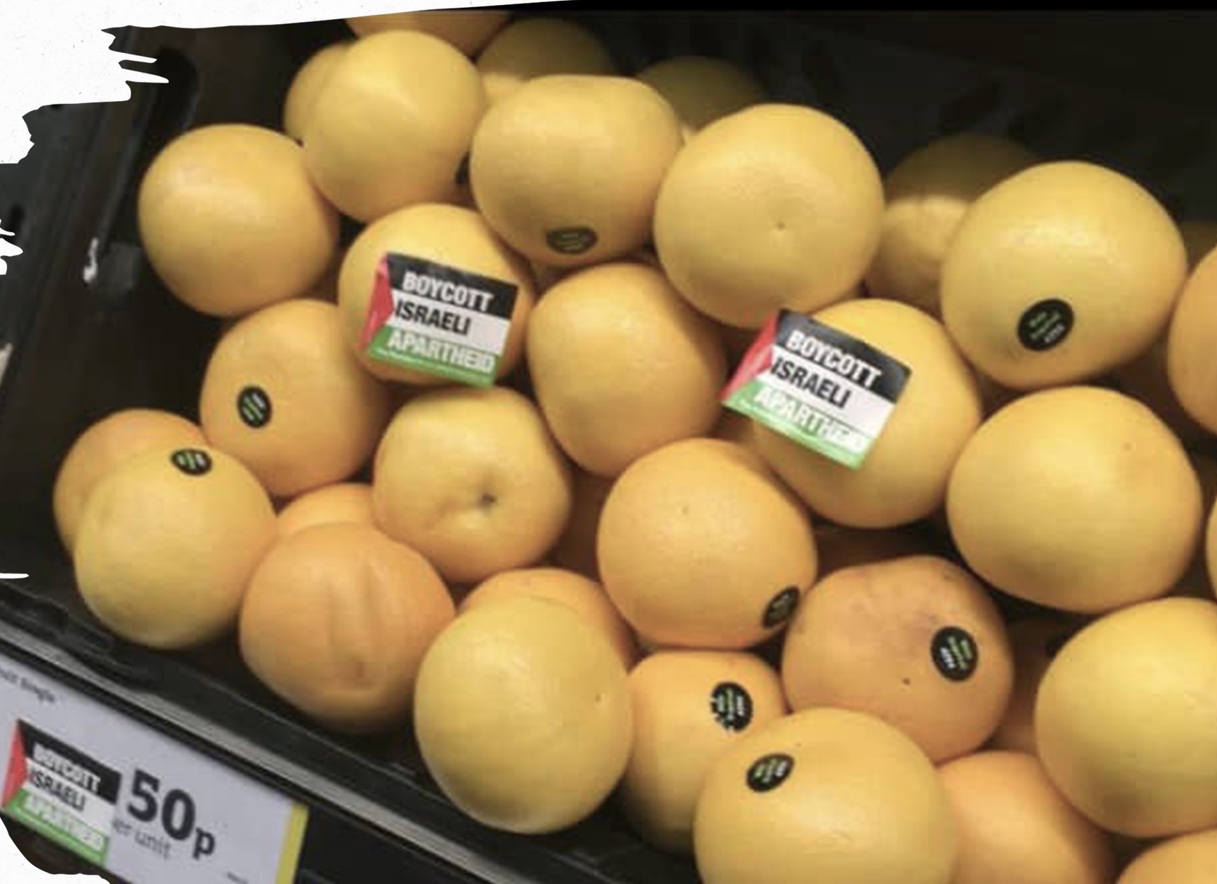 ألصق نشطاء لدى حركة المقاطعة في عاصمة أيرلندا الشمالية "بلفاست" ملصقات تحمل علم فلسطين على منتجات إسرائيلية في عدد من أفرع سلسلة متاجر "سنسبري - Sainsbury's" بالمملكة المتحدة ك، حيث كتبوا عليها "قاطعوا إسرائيل.. فصل عنصري".