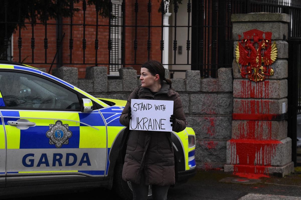 منذ غزو روسيا لأوكرانيا، يتجمع العديد من المتظاهرين بانتظام خارج السفارة الروسية في إيرلندا لدعم الأوكرانيين.