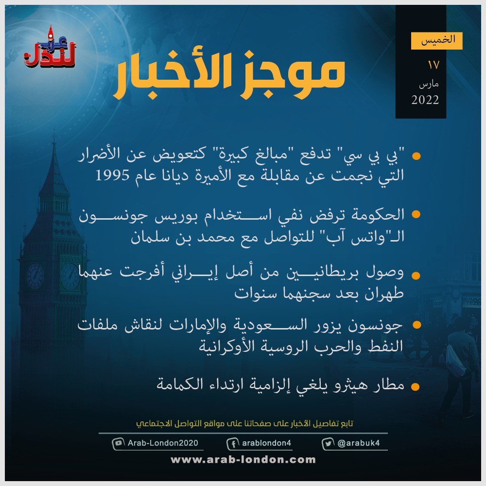 الرئيسية أخبار إليكم موجز الأخبار أخبار إليكم موجز الأخبار 2022-03-17 https://arab-london.com/posts/15092 https://arab-london.com/posts/15090 https://arab-london.com/posts/15089 https://arab-london.com/posts/15083 https://arab-london.com/posts/15082 السابق بريطانيا ستنشر أحدث منظوماتها للدفاع الجوي في بولندا التالي بالفيديو: عصابة مراهقين يتقاتلون بالمناجل في بيرمنغهام والشرطة تبحث عنهم تابعوا آخر أخبار عرب لندن عبر Google News الاكثر قراءة تحقيق: نجل خامنئي يمتلك شققًا فاخرة في لندن بقيمة 50 مليون جنيه قرب السفارة الإسرائيلية 2026-03-10 الديلي ميل: دبي انتهت والناس يفرون منها !! 2026-03-12 بريطانيا على أعتاب أزمة غاز حادّة: المخزون يكفي ليومين فقط وسط شلل في الشحنات العالمية 2026-03-08 هام | بريطانيا تعدل في قوانين الهجرة: تشديد على اللجوء واستثناءات للحالات القائمة 2026-03-09 انخفاض معدل وفيات السرطان في بريطانيا بنسبة الثلث منذ الثمانينيات 2026-03-09 ارتفاع تكاليف القيادة في بريطانيا يحرم الشباب من "حلم الرخصة" 2026-03-09 مقالات ذات صلة فجوة خطرة في جدار قلعة تاريحية تتسبب بوفاة امرأة سقطت في النهر 2026-03-15 بريطانيا تدرس إرسال سفن وطائرات مسيّرة لكشف الألغام في مضيق هرمز 2026-03-15 موجز أخبار بريطانيا من منصة عرب لندن: الأحد: 15 مارس/آذار 2026 2026-03-15 بريطانيا: تحذيرات من "أرفف فارغة" وتكاليف قياسية جراء الحرب الإيرانية 2026-03-15 فيديو| تفجير المركز المالي بدبي.. وهلع وفوبيا الهواتف يتسبب بسجن بريطاني ومصادرة الجوالات؟! 2026-03-15