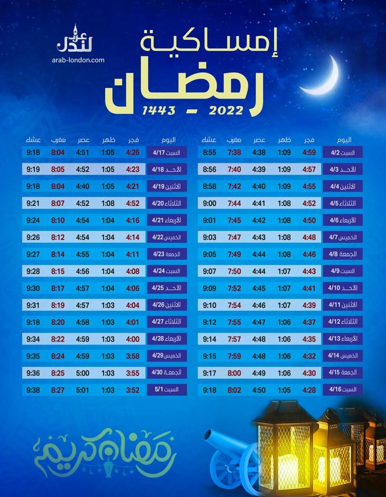 تعرف على إمساكية رمضان 1443- 2022 في المملكة المتحدة - لندن، لمعرفة عدد ساعات الصوم ومواعيد آذان صلاة الفجر والظهر والعصر والمغرب والعشاء، وأوقات الشروق، وموعد انتهاء شهر رمضان المبارك لسنة 2022.
