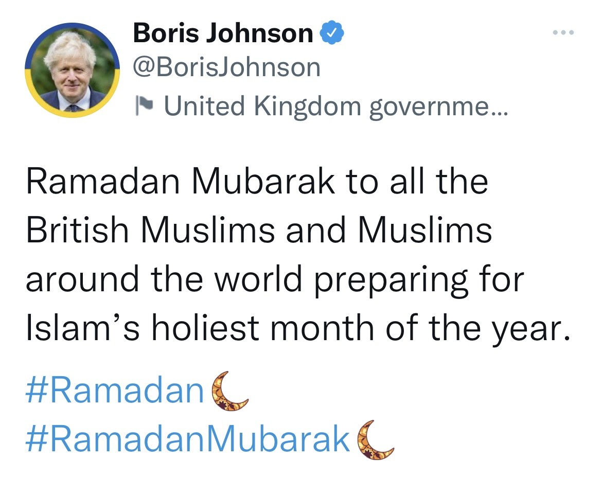 هنأ رئيس الوزراء البريطاني، بوريس جونسون، أبناء الجالية المسلمة في المملكة المتحدة والمسلمين في جميع أنحاء العالم بحلول شهر رمضان المبارك لعام 2022.