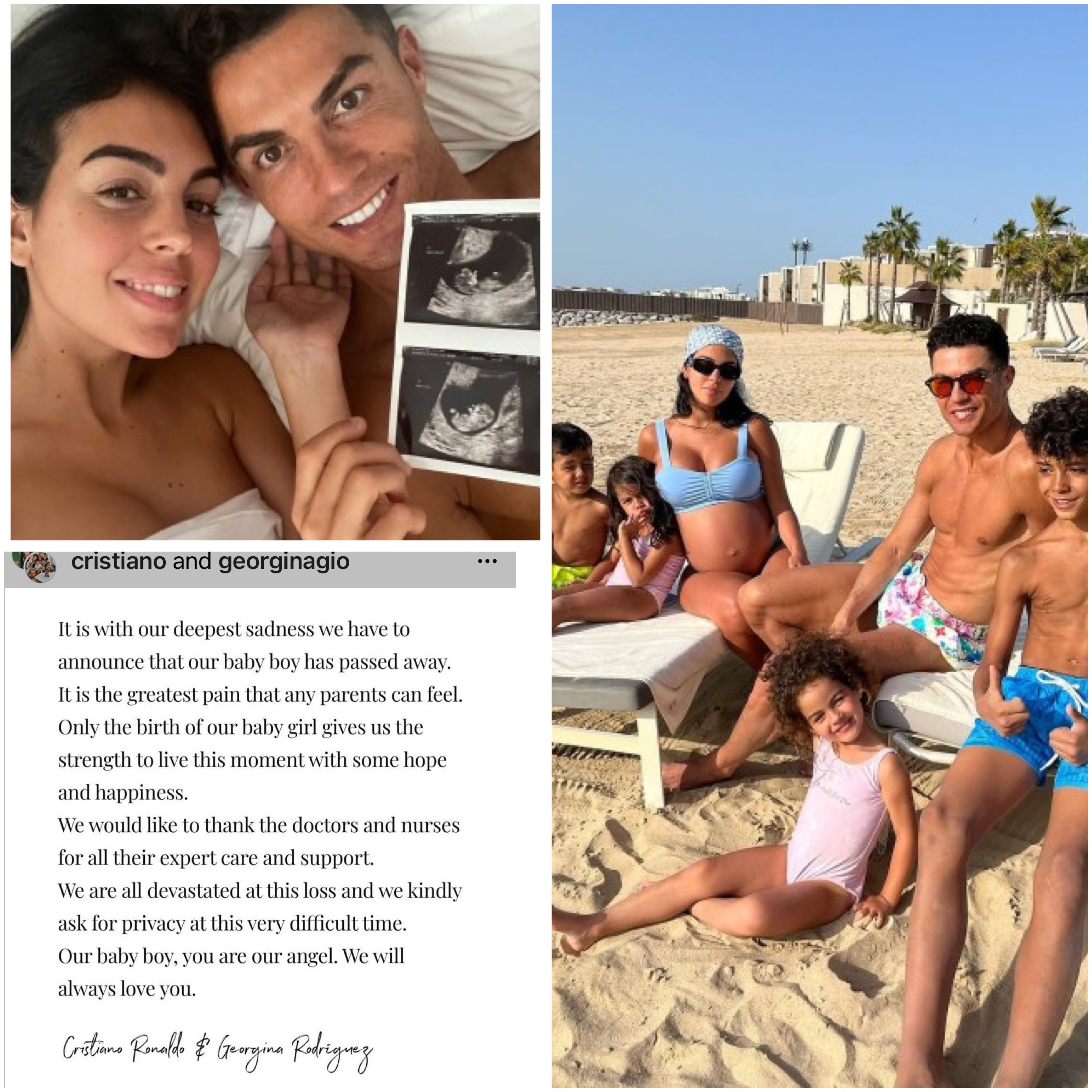 واختتم رونالدو ورودريغيز البيان بقولهما: "طفلنا الصغير، أنت ملاكُنا.. سنُحبك دائما". وكان كل من رونالدو وصديقته ينتظران توأماً، حيث توفي الطفل بينما أنجبت جورجينا رودريغيز الطفلة.