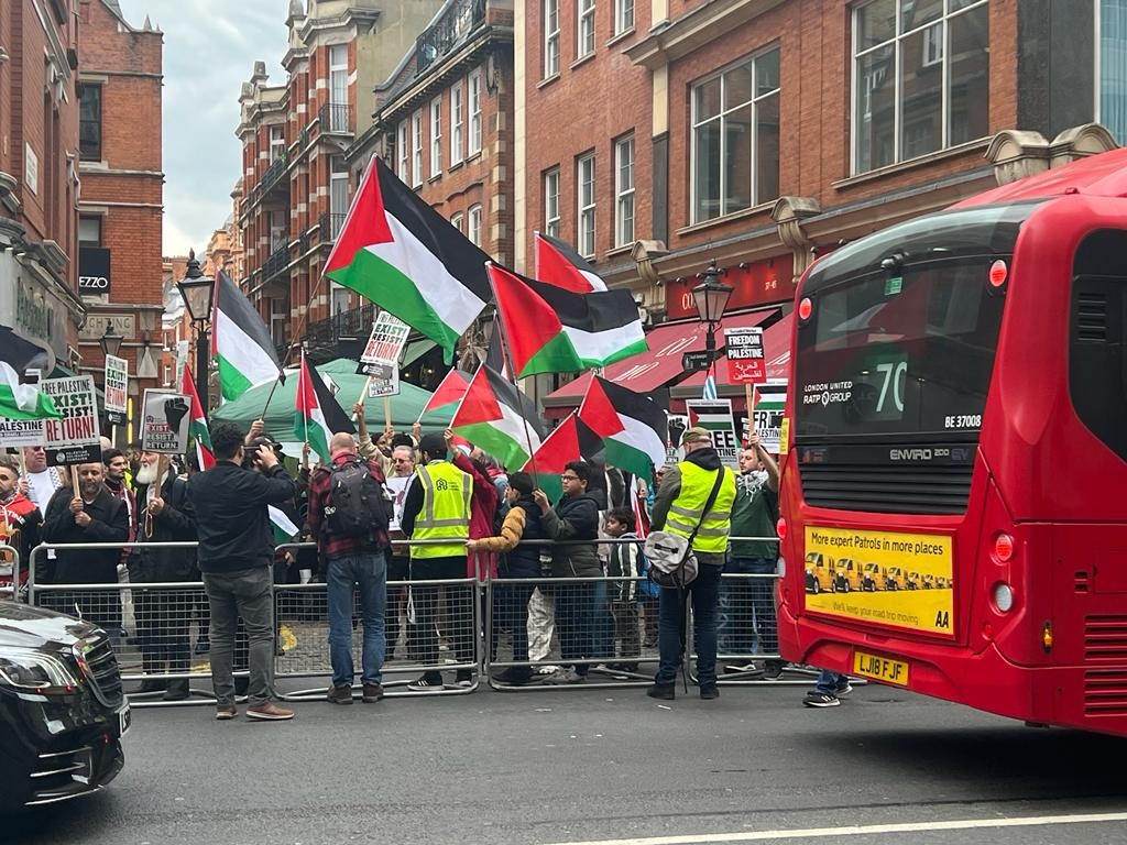 شارك العشرات من أبناء الجالية العربية والفلسطينية إلى جانب عدد من المنظمات الفلسطينية بمظاهرة داعمة للفلسطينيين من أمام السفارة الإسرائيلية بلندن اليوم الجمعة عند الساعة 4:00 مساءً للتنديد بالعدوان الإسرائيلي على الفلسطينيين.