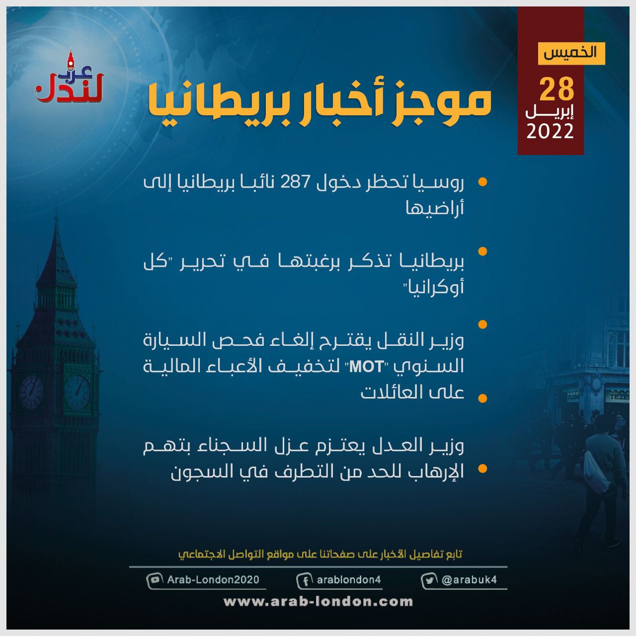 الرئيسية أخبار موجز لأهم أخبار بريطانيا 28-4-2022 أخبار موجز لأهم أخبار بريطانيا 28-4-2022 2022-04-28 عرب لندن - لندن موجز لأهم أخبار بريطانيا 28-4-2022 السابق "Ryanair" تطلق رحلات صيفية إلي إسبانيا وفرنسا وإيطاليا بـ 25 جنيه سترليني التالي تحطم الطائرة المصرية في 2016 سببه تدخين الكابتن سيجارة!! تابعوا آخر أخبار عرب لندن عبر Google News الاكثر قراءة تحقيق: نجل خامنئي يمتلك شققًا فاخرة في لندن بقيمة 50 مليون جنيه قرب السفارة الإسرائيلية 2026-03-10 الديلي ميل: دبي انتهت والناس يفرون منها !! 2026-03-12 هام | بريطانيا تعدل في قوانين الهجرة: تشديد على اللجوء واستثناءات للحالات القائمة 2026-03-09 انخفاض معدل وفيات السرطان في بريطانيا بنسبة الثلث منذ الثمانينيات 2026-03-09 ارتفاع تكاليف القيادة في بريطانيا يحرم الشباب من "حلم الرخصة" 2026-03-09 الحرب الإيرانية تعطل خطط السفر في الأعياد و"بريتيش إيرويز" تلغي رحلاتها للشرق الأوسط 2026-03-11 مقالات ذات صلة تفشي التهاب السحايا في كانتربري يودي بحياة شخصين ويدخل 11 شابًا المستشفى 2026-03-15 محكمة برئاسة كوربين: بريطانيا متواطئة في انتهاك القانون الدولي في غزة 2026-03-15 محادثات أزمة بين ترامب وستارمر لإعادة فتح مضيق هرمز المغلق 2026-03-15 فجوة خطرة في جدار قلعة تاريحية تتسبب بوفاة امرأة وسقوطها في النهر 2026-03-15 بريطانيا تدرس إرسال سفن وطائرات مسيّرة لكشف الألغام في مضيق هرمز 2026-03-15