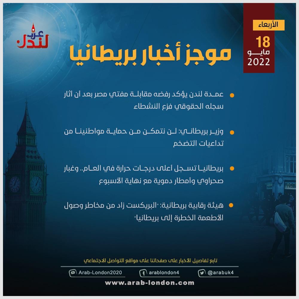 الرئيسية أخبار موجز لأهم أخبار بريطانيا اليوم الأربعاء 18-5-2022 أخبار موجز لأهم أخبار بريطانيا اليوم الأربعاء 18-5-2022 2022-05-18 عرب لندن - لندن موجز لأهم أخبار بريطانيا الأربعاء 18-5-2022 السابق وزيرة بريطانية: بلادنا الوحيدة بين دول السبع التي تفرض ضرائب إضافية وسط أزمة الغلاء المعيشي التالي حزب العمال يطالب بتعليق عضوية النائب المتهم بارتكاب جرائم اغتصاب تابعوا آخر أخبار عرب لندن عبر Google News الاكثر قراءة تحقيق: نجل خامنئي يمتلك شققًا فاخرة في لندن بقيمة 50 مليون جنيه قرب السفارة الإسرائيلية 2026-03-10 الديلي ميل: دبي انتهت والناس يفرون منها !! 2026-03-12 الحرب الإيرانية تعطل خطط السفر في الأعياد و"بريتيش إيرويز" تلغي رحلاتها للشرق الأوسط 2026-03-11 لندن تدرس فرض رسوم إضافية على سيارات الدفع الرباعي للحد من حوادث الطرق 2026-03-13 هل تحولت السياسة الأمريكية إلى حرب صليبية على إيران بقيادة وزير الدفاع الأمريكي؟ 2026-03-12 أمسية حوارية على منصة عرب لندن بعنوان “زلزال قوانين الهجرة البريطانية” 2026-03-14 مقالات ذات صلة موجز أخبار بريطانيا من منصة عرب لندن: الاثنين: 16 مارس/آذار 2026 2026-03-16 بريطانيا تلاحق نساء وتحقق معهن بتهمة الإجهاض غير القانوني 2026-03-16 بريطانيا في دقيقة: وظف شابا واحصل على 3 آلاف جنيه استرليني!!! 2026-03-16 ستارمر يعلن خطة لدعم تكاليف وقود التدفئة وسط أزمة مضيق هرمز 2026-03-16 تفشي التهاب السحايا في كانتربري يودي بحياة شخصين ويدخل 11 شابًا المستشفى 2026-03-15