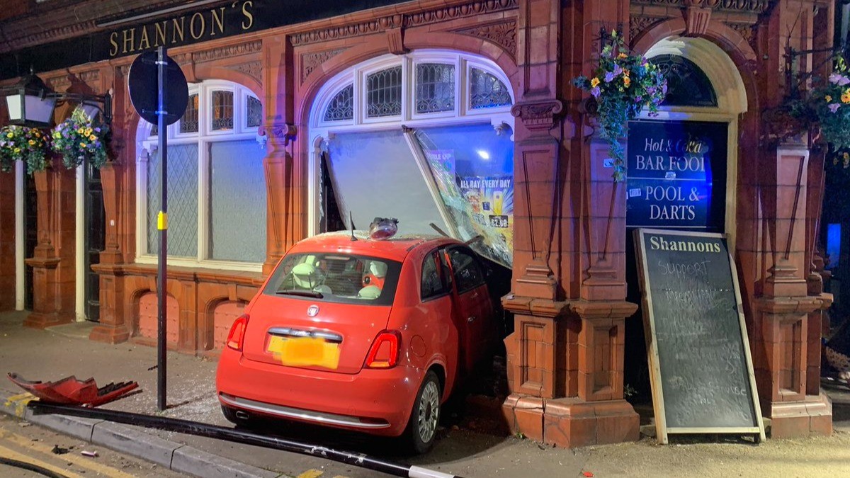 وأظهرت صور للحادث نشرت على منصة "تويتر" سيارة فيات حمراء مخترقة إحدى أبواب حانة شانون في بورديسلي جرين، قرابة الساعة 1 صباحا.
