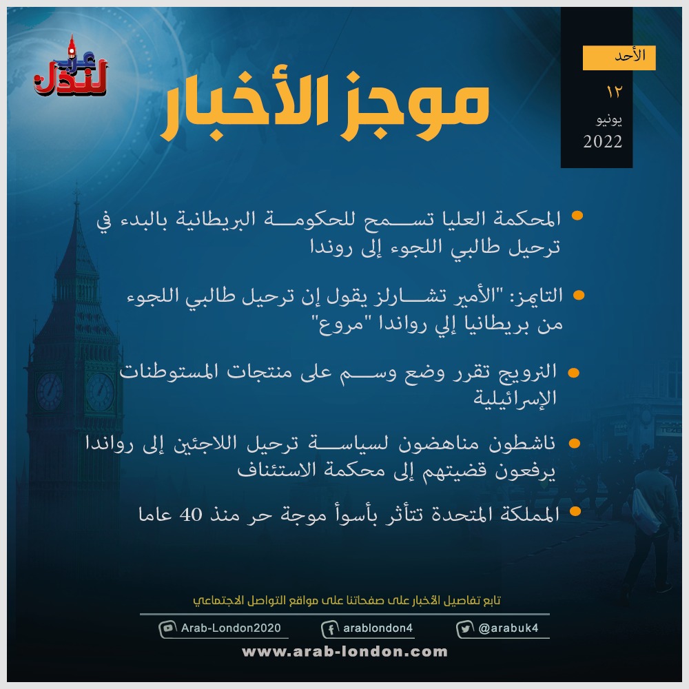 الرئيسية أخبار موجز لأهم أخبار بريطانيا الأحد: 12-6-2022 أخبار موجز لأهم أخبار بريطانيا الأحد: 12-6-2022 2022-06-12 عرب لندن - لندن موجز لأهم أخبار بريطانيا الأحد: 12-6-2022 السابق مقتل بريطاني ثان في المعارك الدائرة في أوكرانيا التالي المملكة المتحدة تتأثر بأسوأ موجة حر منذ 40 عاما تابعوا آخر أخبار عرب لندن عبر Google News الاكثر قراءة تحقيق: نجل خامنئي يمتلك شققًا فاخرة في لندن بقيمة 50 مليون جنيه قرب السفارة الإسرائيلية 2026-03-10 الديلي ميل: دبي انتهت والناس يفرون منها !! 2026-03-12 الحرب الإيرانية تعطل خطط السفر في الأعياد و"بريتيش إيرويز" تلغي رحلاتها للشرق الأوسط 2026-03-11 لندن تدرس فرض رسوم إضافية على سيارات الدفع الرباعي للحد من حوادث الطرق 2026-03-13 هل تحولت السياسة الأمريكية إلى حرب صليبية على إيران بقيادة وزير الدفاع الأمريكي؟ 2026-03-12 أمسية حوارية على منصة عرب لندن بعنوان “زلزال قوانين الهجرة البريطانية” 2026-03-14 مقالات ذات صلة مكتب الأرصاد الجوية البريطاني: احتمالية تساقط الثلوج لا تزال قائمة في مارس 2026-03-16 موجز أخبار بريطانيا من منصة عرب لندن: الاثنين: 16 مارس/آذار 2026 2026-03-16 بريطانيا تلاحق نساء وتحقق معهن بتهمة الإجهاض غير القانوني 2026-03-16 بريطانيا في دقيقة: وظف شابا واحصل على 3 آلاف جنيه استرليني!!! 2026-03-16 ستارمر يعلن خطة لدعم تكاليف وقود التدفئة وسط أزمة مضيق هرمز 2026-03-16