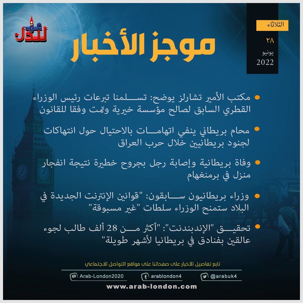 الرئيسية أخبار موجز لأهم أخبار بريطانيا يوم الثلاثاء (28-6-2022) أخبار موجز لأهم أخبار بريطانيا يوم الثلاثاء (28-6-2022) 2022-06-28 السابق المسلمون البريطانيون: "دفعنا تكاليف رحلة الحج عبر نظام "مطوف" فخسرنا أموالنا ولم نسافر" التالي فيديو: صحافية لجونسون هل فعلا ستبني بيتا فارها لابنك على شجرة؟!! شاهد ماذا قال تابعوا آخر أخبار عرب لندن عبر Google News الاكثر قراءة تحقيق: نجل خامنئي يمتلك شققًا فاخرة في لندن بقيمة 50 مليون جنيه قرب السفارة الإسرائيلية 2026-03-10 الديلي ميل: دبي انتهت والناس يفرون منها !! 2026-03-12 الحرب الإيرانية تعطل خطط السفر في الأعياد و"بريتيش إيرويز" تلغي رحلاتها للشرق الأوسط 2026-03-11 لندن تدرس فرض رسوم إضافية على سيارات الدفع الرباعي للحد من حوادث الطرق 2026-03-13 هل تحولت السياسة الأمريكية إلى حرب صليبية على إيران بقيادة وزير الدفاع الأمريكي؟ 2026-03-12 أمسية حوارية على منصة عرب لندن بعنوان “زلزال قوانين الهجرة البريطانية” 2026-03-14 مقالات ذات صلة مكتب الأرصاد الجوية البريطاني: احتمالية تساقط الثلوج لا تزال قائمة في مارس 2026-03-16 موجز أخبار بريطانيا من منصة عرب لندن: الاثنين: 16 مارس/آذار 2026 2026-03-16 بريطانيا تلاحق نساء وتحقق معهن بتهمة الإجهاض غير القانوني 2026-03-16 بريطانيا في دقيقة: وظف شابا واحصل على 3 آلاف جنيه استرليني!!! 2026-03-16 ستارمر يعلن خطة لدعم تكاليف وقود التدفئة وسط أزمة مضيق هرمز 2026-03-16