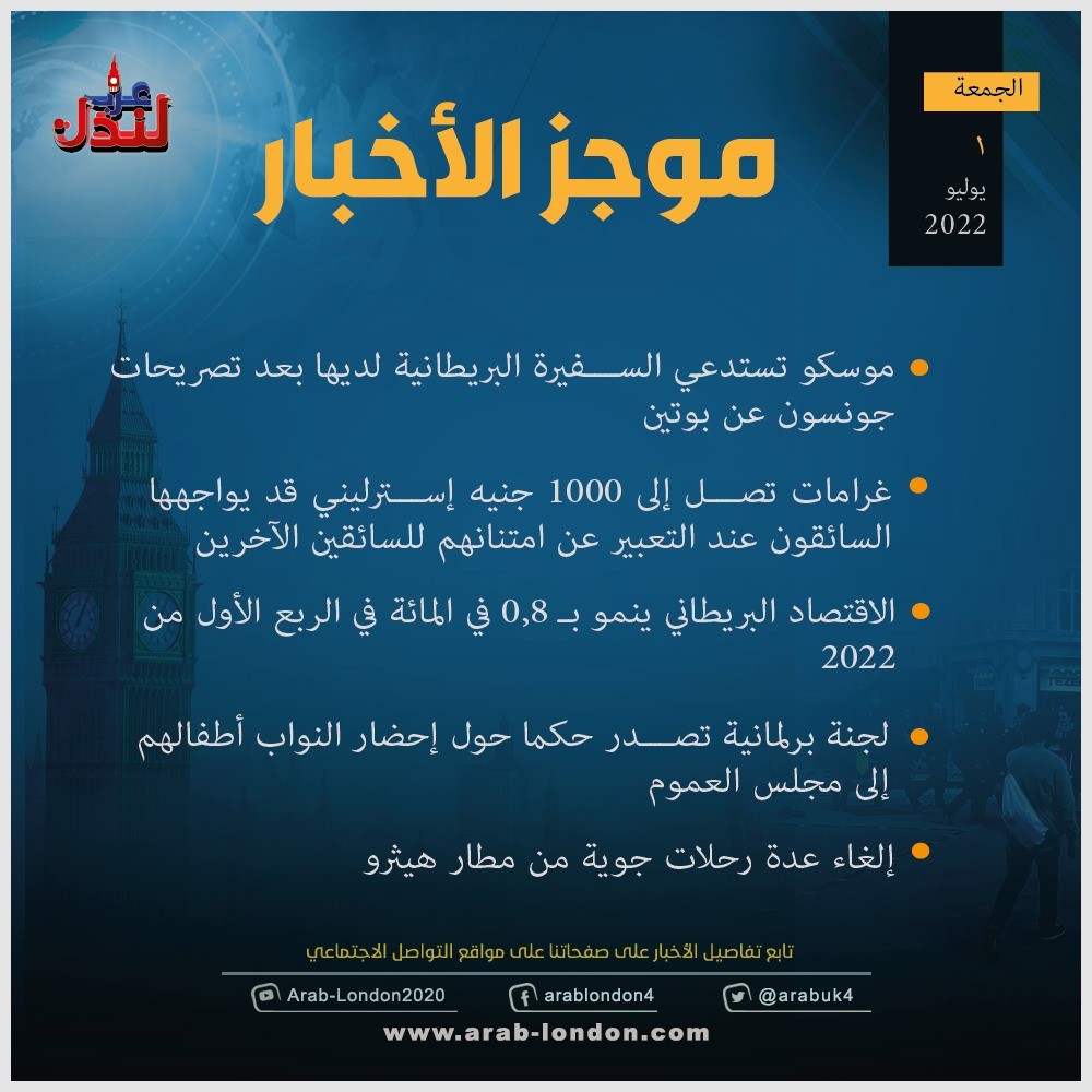 الرئيسية أخبار موجز لأهم أخبار بريطانيا يوم الجمعة 1-7-2022 أخبار موجز لأهم أخبار بريطانيا يوم الجمعة 1-7-2022 2022-07-01 السابق إحالة وزارة الداخلية البريطانية إلى المحكمة العليا لمعاملتها "غير القانونية" مع مواطني الاتحاد الأوروبي التالي السياح البريطانيون مدخنو السجائر الإلكترونية قد يواجهون غرامات مالية والسجن أحياناً تابعوا آخر أخبار عرب لندن عبر Google News الاكثر قراءة تحقيق: نجل خامنئي يمتلك شققًا فاخرة في لندن بقيمة 50 مليون جنيه قرب السفارة الإسرائيلية 2026-03-10 الديلي ميل: دبي انتهت والناس يفرون منها !! 2026-03-12 الحرب الإيرانية تعطل خطط السفر في الأعياد و"بريتيش إيرويز" تلغي رحلاتها للشرق الأوسط 2026-03-11 لندن تدرس فرض رسوم إضافية على سيارات الدفع الرباعي للحد من حوادث الطرق 2026-03-13 هل تحولت السياسة الأمريكية إلى حرب صليبية على إيران بقيادة وزير الدفاع الأمريكي؟ 2026-03-12 أمسية حوارية على منصة عرب لندن بعنوان “زلزال قوانين الهجرة البريطانية” 2026-03-14 مقالات ذات صلة مكتب الأرصاد الجوية البريطاني: احتمالية تساقط الثلوج لا تزال قائمة في مارس 2026-03-16 موجز أخبار بريطانيا من منصة عرب لندن: الاثنين: 16 مارس/آذار 2026 2026-03-16 بريطانيا تلاحق نساء وتحقق معهن بتهمة الإجهاض غير القانوني 2026-03-16 بريطانيا في دقيقة: وظف شابا واحصل على 3 آلاف جنيه استرليني!!! 2026-03-16 ستارمر يعلن خطة لدعم تكاليف وقود التدفئة وسط أزمة مضيق هرمز 2026-03-16