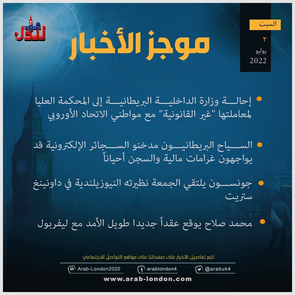 الرئيسية أخبار موجز لأهم أخبار بريطانيا اليوم السبت 2-7-2022 أخبار موجز لأهم أخبار بريطانيا اليوم السبت 2-7-2022 2022-07-02 عرب لندن - لندن موجز لأهم أخبار بريطانيا اليوم السبت 2-7-2022 السابق موجة جديدة من الفوضى في انتظار المسافرين البريطانيين خلال شهر يوليو التالي فضيحة جنسية جديدة تهز حكومة بوريس جونسون تابعوا آخر أخبار عرب لندن عبر Google News الاكثر قراءة تحقيق: نجل خامنئي يمتلك شققًا فاخرة في لندن بقيمة 50 مليون جنيه قرب السفارة الإسرائيلية 2026-03-10 الديلي ميل: دبي انتهت والناس يفرون منها !! 2026-03-12 الحرب الإيرانية تعطل خطط السفر في الأعياد و"بريتيش إيرويز" تلغي رحلاتها للشرق الأوسط 2026-03-11 لندن تدرس فرض رسوم إضافية على سيارات الدفع الرباعي للحد من حوادث الطرق 2026-03-13 هل تحولت السياسة الأمريكية إلى حرب صليبية على إيران بقيادة وزير الدفاع الأمريكي؟ 2026-03-12 أمسية حوارية على منصة عرب لندن بعنوان “زلزال قوانين الهجرة البريطانية” 2026-03-14 مقالات ذات صلة مكتب الأرصاد الجوية البريطاني: احتمالية تساقط الثلوج لا تزال قائمة في مارس 2026-03-16 موجز أخبار بريطانيا من منصة عرب لندن: الاثنين: 16 مارس/آذار 2026 2026-03-16 بريطانيا تلاحق نساء وتحقق معهن بتهمة الإجهاض غير القانوني 2026-03-16 بريطانيا في دقيقة: وظف شابا واحصل على 3 آلاف جنيه استرليني!!! 2026-03-16 ستارمر يعلن خطة لدعم تكاليف وقود التدفئة وسط أزمة مضيق هرمز 2026-03-16