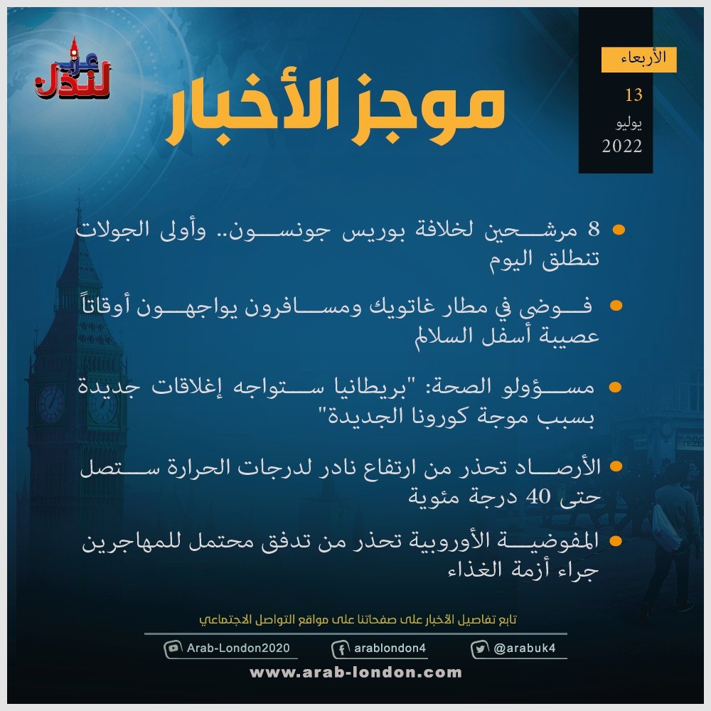 الرئيسية أخبار موجز لأهم الأخبار اليوم الأربعاء 13-7-2022 أخبار موجز لأهم الأخبار اليوم الأربعاء 13-7-2022 2022-07-13 السابق جولة تصويت أولى للنواب المحافظين لاختيار خلف لجونسون التالي بريطانيا… رجل متهم بقتل زوجته بعد ستة أشهر من إنجابها طفل أنابيب تابعوا آخر أخبار عرب لندن عبر Google News الاكثر قراءة تحقيق: نجل خامنئي يمتلك شققًا فاخرة في لندن بقيمة 50 مليون جنيه قرب السفارة الإسرائيلية 2026-03-10 الديلي ميل: دبي انتهت والناس يفرون منها !! 2026-03-12 الحرب الإيرانية تعطل خطط السفر في الأعياد و"بريتيش إيرويز" تلغي رحلاتها للشرق الأوسط 2026-03-11 لندن تدرس فرض رسوم إضافية على سيارات الدفع الرباعي للحد من حوادث الطرق 2026-03-13 هل تحولت السياسة الأمريكية إلى حرب صليبية على إيران بقيادة وزير الدفاع الأمريكي؟ 2026-03-12 أمسية حوارية على منصة عرب لندن بعنوان “زلزال قوانين الهجرة البريطانية” 2026-03-14 مقالات ذات صلة مكتب الأرصاد الجوية البريطاني: احتمالية تساقط الثلوج لا تزال قائمة في مارس 2026-03-16 موجز أخبار بريطانيا من منصة عرب لندن: الاثنين: 16 مارس/آذار 2026 2026-03-16 بريطانيا تلاحق نساء وتحقق معهن بتهمة الإجهاض غير القانوني 2026-03-16 بريطانيا في دقيقة: وظف شابا واحصل على 3 آلاف جنيه استرليني!!! 2026-03-16 ستارمر يعلن خطة لدعم تكاليف وقود التدفئة وسط أزمة مضيق هرمز 2026-03-16