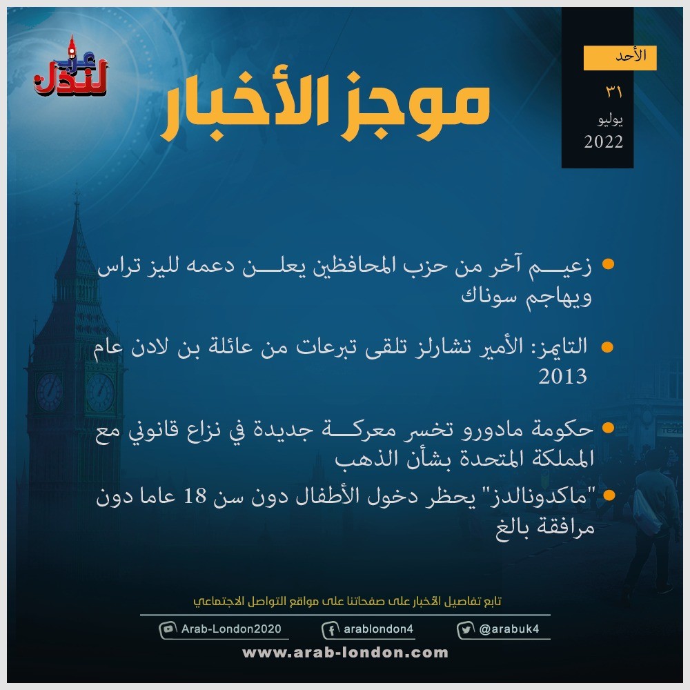 الرئيسية أخبار موجز لأهم الأخبار الأحد 31-7-2022 أخبار موجز لأهم الأخبار الأحد 31-7-2022 2022-07-31 السابق إيزي جيت تتخلى عن ركابها البريطانيين في تركيا الذين اضطروا للنوم على أرض المطار التالي دراسة: "كورونا الطويل الأمد يكلف بريطانيا 1.5 مليار جنيه سنوياً" تابعوا آخر أخبار عرب لندن عبر Google News الاكثر قراءة تحقيق: نجل خامنئي يمتلك شققًا فاخرة في لندن بقيمة 50 مليون جنيه قرب السفارة الإسرائيلية 2026-03-10 الديلي ميل: دبي انتهت والناس يفرون منها !! 2026-03-12 الحرب الإيرانية تعطل خطط السفر في الأعياد و"بريتيش إيرويز" تلغي رحلاتها للشرق الأوسط 2026-03-11 لندن تدرس فرض رسوم إضافية على سيارات الدفع الرباعي للحد من حوادث الطرق 2026-03-13 هل تحولت السياسة الأمريكية إلى حرب صليبية على إيران بقيادة وزير الدفاع الأمريكي؟ 2026-03-12 أمسية حوارية على منصة عرب لندن بعنوان “زلزال قوانين الهجرة البريطانية” 2026-03-14 مقالات ذات صلة موجز أخبار بريطانيا من منصة عرب لندن: الثلاثاء: 17 مارس/آذار 2026 2026-03-17 الخطوط الجوية البريطانية تلغي رحلاتها إلى الشرق الأوسط حتى الصيف 2026-03-17 تقرير: 70% من البريطانيين يرفضون "مغامرة" الحرب على إيران.. ومطالب بخفض أسعار الطاقة 2026-03-17 ستارمر ينأى ببريطانيا عن حرب إيران وقادة أوروبا يستبعدون إرسال سفن حربية 2026-03-17 مكتب الأرصاد الجوية البريطاني: احتمالية تساقط الثلوج لا تزال قائمة في مارس 2026-03-16