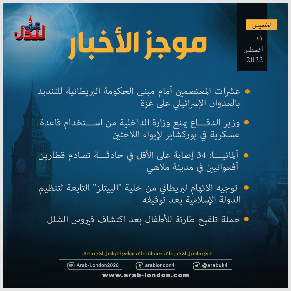 الرئيسية أخبار موجز لأهم أخبار بريطانيا 12/8/2022 أخبار موجز لأهم أخبار بريطانيا 12/8/2022 2022-08-11 عرب لندن - لندن موجز لأهم أخبار بريطانيا 12/8/2022 السابق السجن ست سنوات لرجل ثان من خاطفي كلاب ليدي غاغا التالي الكشف عن عملة جديدة تحمل توقيع الملكة إليزابيث الثانية تابعوا آخر أخبار عرب لندن عبر Google News الاكثر قراءة تحقيق: نجل خامنئي يمتلك شققًا فاخرة في لندن بقيمة 50 مليون جنيه قرب السفارة الإسرائيلية 2026-03-10 الديلي ميل: دبي انتهت والناس يفرون منها !! 2026-03-12 الحرب الإيرانية تعطل خطط السفر في الأعياد و"بريتيش إيرويز" تلغي رحلاتها للشرق الأوسط 2026-03-11 لندن تدرس فرض رسوم إضافية على سيارات الدفع الرباعي للحد من حوادث الطرق 2026-03-13 هل تحولت السياسة الأمريكية إلى حرب صليبية على إيران بقيادة وزير الدفاع الأمريكي؟ 2026-03-12 أمسية حوارية على منصة عرب لندن بعنوان “زلزال قوانين الهجرة البريطانية” 2026-03-14 مقالات ذات صلة موجز أخبار بريطانيا من منصة عرب لندن: الثلاثاء: 17 مارس/آذار 2026 2026-03-17 الخطوط الجوية البريطانية تلغي رحلاتها إلى الشرق الأوسط حتى الصيف 2026-03-17 تقرير: 70% من البريطانيين يرفضون "مغامرة" الحرب على إيران.. ومطالب بخفض أسعار الطاقة 2026-03-17 ستارمر ينأى ببريطانيا عن حرب إيران وقادة أوروبا يستبعدون إرسال سفن حربية 2026-03-17 مكتب الأرصاد الجوية البريطاني: احتمالية تساقط الثلوج لا تزال قائمة في مارس 2026-03-16