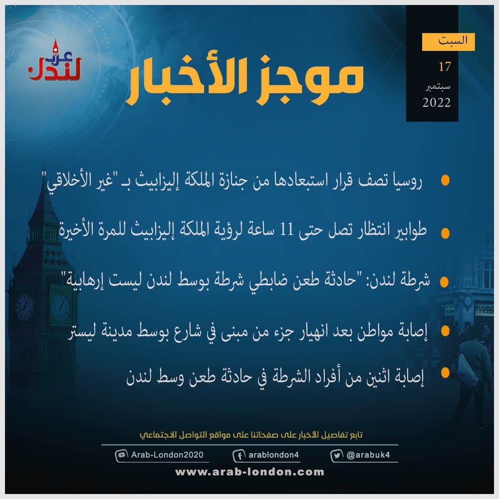 الرئيسية أخبار موجز لأهم أخبار بريطانيا السبت (17-9-2022) أخبار موجز لأهم أخبار بريطانيا السبت (17-9-2022) 2022-09-17 عرب لندن - لندن موجز لأهم أخبار بريطانيا، السبت 17-9-2022 السابق القبض على متهم بالتحرش بامرأتين أثناء انتظار رؤية نعش الملكة إليزابيث في وستمنستر التالي نائب الرئيس الصيني سيحضر مراسم دفن الملكة إليزابيث الثانية تابعوا آخر أخبار عرب لندن عبر Google News الاكثر قراءة الديلي ميل: دبي انتهت والناس يفرون منها !! 2026-03-12 الحرب الإيرانية تعطل خطط السفر في الأعياد و"بريتيش إيرويز" تلغي رحلاتها للشرق الأوسط 2026-03-11 لندن تدرس فرض رسوم إضافية على سيارات الدفع الرباعي للحد من حوادث الطرق 2026-03-13 أمسية حوارية على منصة عرب لندن بعنوان “زلزال قوانين الهجرة البريطانية” 2026-03-14 هل تحولت السياسة الأمريكية إلى حرب صليبية على إيران بقيادة وزير الدفاع الأمريكي؟ 2026-03-12 مهندس بريطاني يحوّل طائرة "بوينغ 737" إلى ملجأ نووي في حديقة منزله 2026-03-12 مقالات ذات صلة شرطة لندن تضغط على واشنطن لكشف ملفات إبستين الكاملة في قضية ماندلسون 2026-03-17 هل تخطط لاختبار القيادة؟ DVSA تطلق قواعد جديدة للحجز ابتداءً من مايو 2026-03-17 "عار وطني": تراكم أعمال إصلاح الحفر يصل إلى 18.6 مليار جنيه إسترليني في إنجلترا وويلز 2026-03-17 شرطة ساسكس تطلق تحذيرًا للجمهور بعد هروب سجين خطير من سجن فورد 2026-03-17 مجلس كينت يعلن عبور القوارب الصغيرة تهديدًا إرهابيًا ويصوّت على "حالة طوارئ الهجرة" 2026-03-17