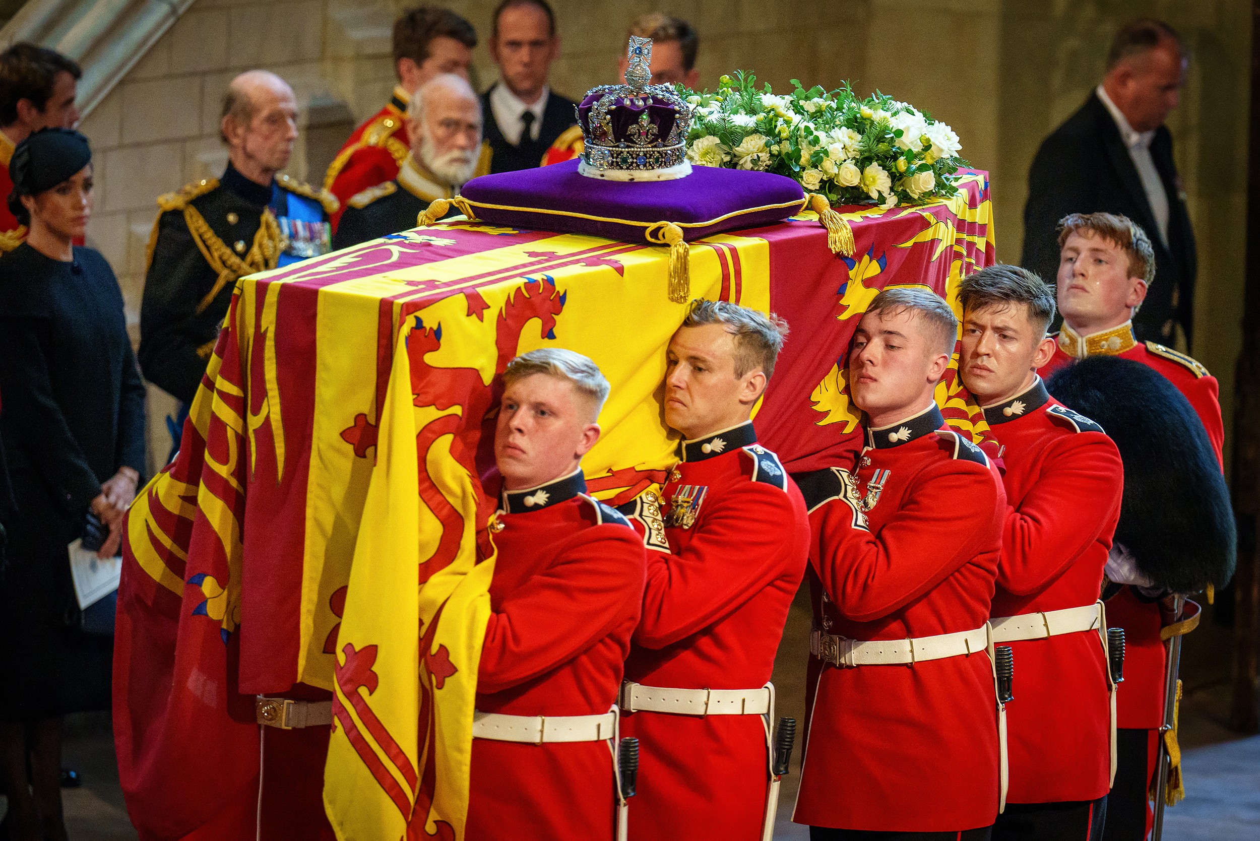 بعد حداد وطني امتد 10 أيام تخللته مراسم تكريم وطقوس تعود لمئات السنين، تنتظر مشاركة ألفي شخص في المراسم الدينية في كاتدرائية ويستمنستر عند الساعة العاشرة بتوقيت غرينتش. ومن بين الحضور الرئيس الأميركي جو بايدن وامبراطور اليابان ناروهيتو والرئيس الفرنسي إيمانيول ماكرون ورئيس الوزراء الكندي جاستن ترودو ورئيسة المفوضية الأوروبية أورسولا فون دير لايين. وأعلن مجيء نائب الرئيس الصيني وانغ كيشان كذلك.