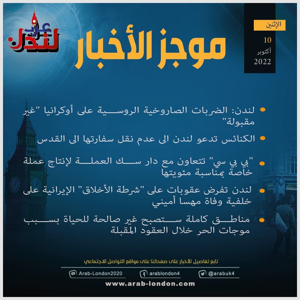 الرئيسية أخبار موجز لأهم أخبار بريطانيا الإثنين (10/10/2022) أخبار موجز لأهم أخبار بريطانيا الإثنين (10/10/2022) 2022-10-10 عرب لندن - لندن موجز لأهم أخبار بريطانيا الإثنين (10/10/2022) السابق تقرير دولي : هؤلاء مهددون أكثر بارتفاع للحرارة فوق احتمال البشر التالي تيسكو تقدم وجبات مجانية للأطفال خلال شهر أكتوبر تابعوا آخر أخبار عرب لندن عبر Google News الاكثر قراءة الديلي ميل: دبي انتهت والناس يفرون منها !! 2026-03-12 لندن تدرس فرض رسوم إضافية على سيارات الدفع الرباعي للحد من حوادث الطرق 2026-03-13 هل تحولت السياسة الأمريكية إلى حرب صليبية على إيران بقيادة وزير الدفاع الأمريكي؟ 2026-03-12 أمسية حوارية على منصة عرب لندن بعنوان “زلزال قوانين الهجرة البريطانية” 2026-03-14 وفاتان في بريطانيا بمرض التهاب السحايا: ما هو وما أعراضه وكيف تحمي نفسك؟ 2026-03-17 مهندس بريطاني يحوّل طائرة "بوينغ 737" إلى ملجأ نووي في حديقة منزله 2026-03-12 مقالات ذات صلة عاجل| بسبب تبييض جرائم الحرب في السودان.. شبكة "سكاي نيوز" تنهي شراكتها مع الإمارات 2026-03-18 إنجلترا تستعد لتطبيق نظام "إعادة التدوير المبسّط": قواعد صارمة وغرامات مالية وشيكة 2026-03-18 الملك تشارلز يستقبل الرئيس النيجيري في أول زيارة دولة منذ 37 عاماً 2026-03-18 مسؤول بريطاني يحذر: الصراع مع إيران سيزيد من تدفق قوارب المهاجرين 2026-03-18 بعد حملة معارضة واسعة: البرلمان الإسكتلندي يصوت ضد مشروع قانون "الموت الرحيم" 2026-03-18
