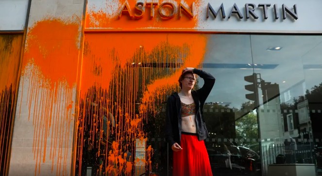 استهدف ناشطون بيئيون، الأحد، صالة عرض تابعة لشركة سيارات أستون مارتن في وسط لندن، حيث قاموا برش طلاء برتقالي على واجهتها، في وقت تعهدت فيه وزيرة الداخلية البريطانية بتعزيز صلاحيات الشرطة لوقف موجة الاحتجاجات البيئية هذه.