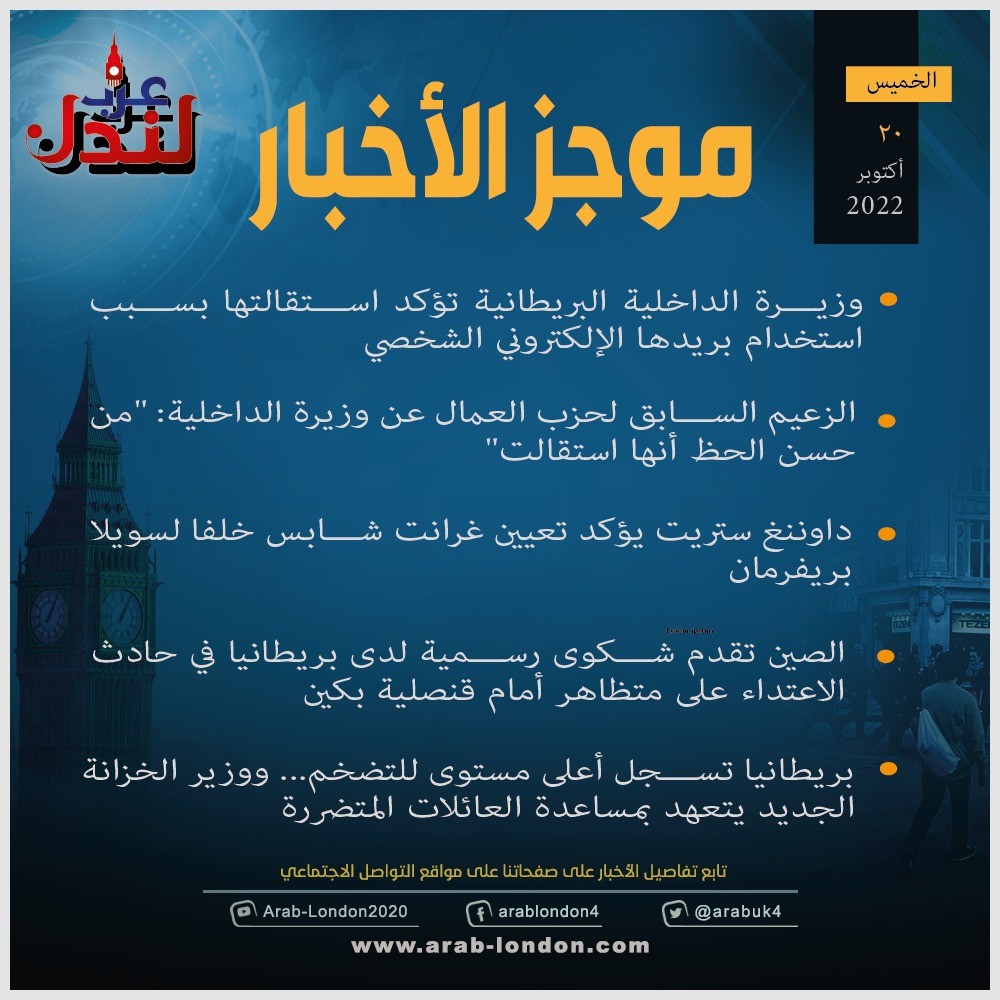الرئيسية أخبار موجز لأهم أخبار بريطانيا اليوم الخميس (20-10-2022) أخبار موجز لأهم أخبار بريطانيا اليوم الخميس (20-10-2022) 2022-10-20 عرب لندن - لندن موجز لأهم أخبار بريطانيا اليوم الخميس (20-10-2022) السابق عاجل: رئيسة وزراء بريطانيا تعلن استقالتها التالي مركز "Hartshead Moor" لخدمات الطرق يصنف على أنه "الأسوأ" في بريطانيا تابعوا آخر أخبار عرب لندن عبر Google News الاكثر قراءة الديلي ميل: دبي انتهت والناس يفرون منها !! 2026-03-12 لندن تدرس فرض رسوم إضافية على سيارات الدفع الرباعي للحد من حوادث الطرق 2026-03-13 هل تحولت السياسة الأمريكية إلى حرب صليبية على إيران بقيادة وزير الدفاع الأمريكي؟ 2026-03-12 أمسية حوارية على منصة عرب لندن بعنوان “زلزال قوانين الهجرة البريطانية” 2026-03-14 وفاتان في بريطانيا بمرض التهاب السحايا: ما هو وما أعراضه وكيف تحمي نفسك؟ 2026-03-17 مهندس بريطاني يحوّل طائرة "بوينغ 737" إلى ملجأ نووي في حديقة منزله 2026-03-12 مقالات ذات صلة عاجل| بسبب تبييض جرائم الحرب في السودان.. شبكة "سكاي نيوز" تنهي شراكتها مع الإمارات 2026-03-18 إنجلترا تستعد لتطبيق نظام "إعادة التدوير المبسّط": قواعد صارمة وغرامات مالية وشيكة 2026-03-18 الملك تشارلز يستقبل الرئيس النيجيري في أول زيارة دولة منذ 37 عاماً 2026-03-18 مسؤول بريطاني يحذر: الصراع مع إيران سيزيد من تدفق قوارب المهاجرين 2026-03-18 بعد حملة معارضة واسعة: البرلمان الإسكتلندي يصوت ضد مشروع قانون "الموت الرحيم" 2026-03-18