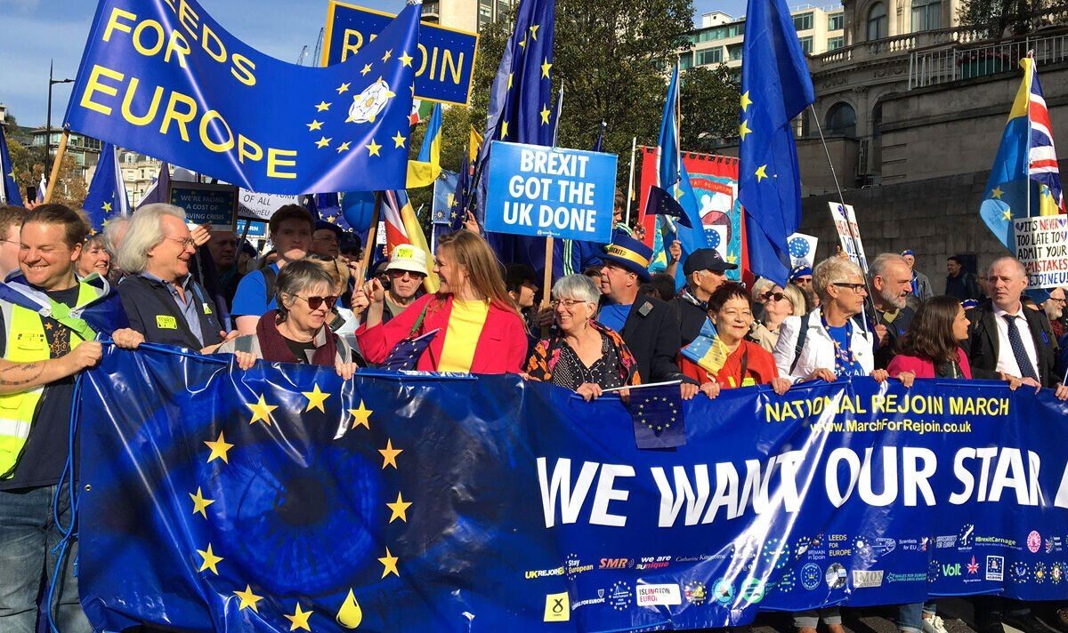 خرج آلاف المتظاهرين في مسيرة وسط لندن يوم أمس السبت، للمطالبة بإعادة انضمام بريطانيا للاتحاد الأوروبي، وفقا لما نقلته "الغارديان".