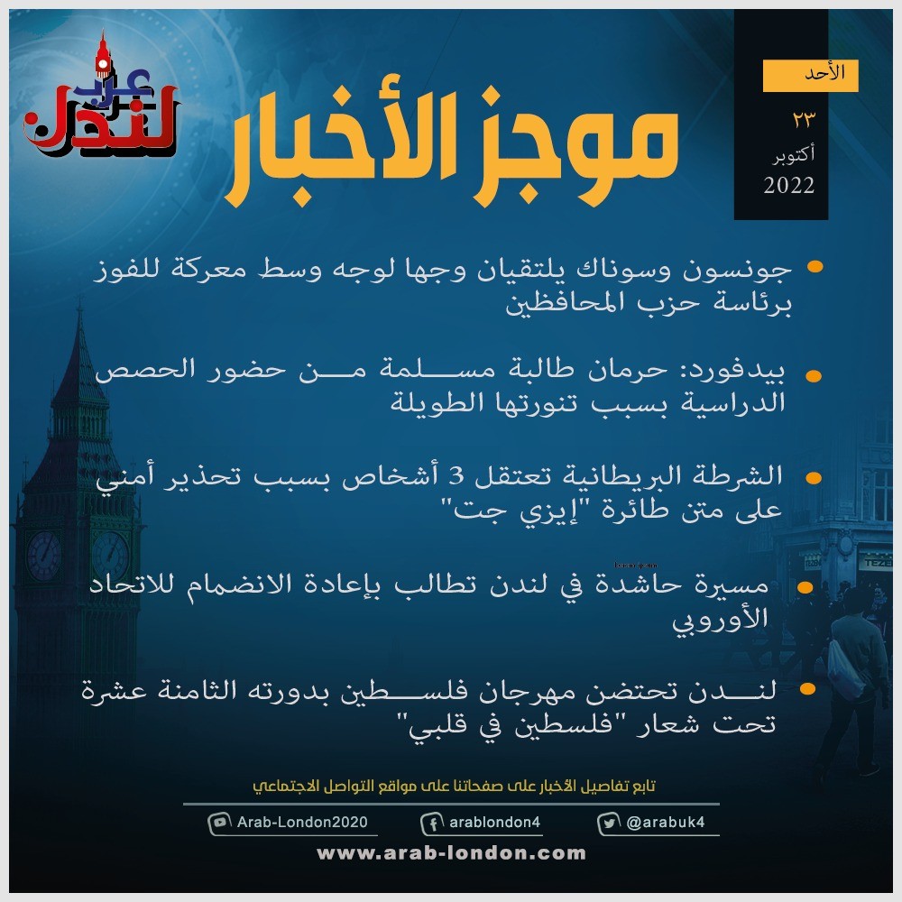الرئيسية أخبار موجز لأهم أخبار بريطانيا الأحد (23-10-2022) أخبار موجز لأهم أخبار بريطانيا الأحد (23-10-2022) 2022-10-23 السابق عاجل .. وزير المال البريطاني السابق ريشي سوناك يعلن ترشحه لرئاسة الوزراء التالي مسيرة حاشدة في لندن تطالب بإعادة الانضمام للاتحاد الأوروبي تابعوا آخر أخبار عرب لندن عبر Google News الاكثر قراءة الديلي ميل: دبي انتهت والناس يفرون منها !! 2026-03-12 لندن تدرس فرض رسوم إضافية على سيارات الدفع الرباعي للحد من حوادث الطرق 2026-03-13 هل تحولت السياسة الأمريكية إلى حرب صليبية على إيران بقيادة وزير الدفاع الأمريكي؟ 2026-03-12 أمسية حوارية على منصة عرب لندن بعنوان “زلزال قوانين الهجرة البريطانية” 2026-03-14 وفاتان في بريطانيا بمرض التهاب السحايا: ما هو وما أعراضه وكيف تحمي نفسك؟ 2026-03-17 مهندس بريطاني يحوّل طائرة "بوينغ 737" إلى ملجأ نووي في حديقة منزله 2026-03-12 مقالات ذات صلة موجز أخبار بريطانيا من منصة عرب لندن: الأربعاء: 17 مارس/آذار 2026 2026-03-18 كاميرات "بدون فلاش": تكنولوجيا رادارية متطورة لرصد السرعة في لندن 2026-03-18 عاجل| بسبب تبييض جرائم الحرب في السودان.. شبكة "سكاي نيوز" تنهي شراكتها مع الإمارات 2026-03-18 إنجلترا تستعد لتطبيق نظام "إعادة التدوير المبسّط": قواعد صارمة وغرامات مالية وشيكة 2026-03-18 الملك تشارلز يستقبل الرئيس النيجيري في أول زيارة دولة منذ 37 عاماً 2026-03-18