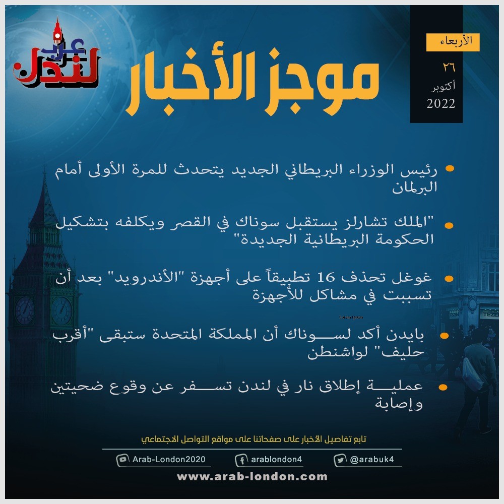 الرئيسية أخبار موجز لأهم أخبار بريطانيا الأربعاء (26-10-2022) أخبار موجز لأهم أخبار بريطانيا الأربعاء (26-10-2022) 2022-10-26 السابق لندن ترجئ لأسبوعين عرض خطة الموازنة الجديدة المنتظرة التالي طفلة بريطانية تتعرض لهجوم شرس من قبل كلب الجيران يفقدها وجنتها تابعوا آخر أخبار عرب لندن عبر Google News الاكثر قراءة الديلي ميل: دبي انتهت والناس يفرون منها !! 2026-03-12 لندن تدرس فرض رسوم إضافية على سيارات الدفع الرباعي للحد من حوادث الطرق 2026-03-13 هل تحولت السياسة الأمريكية إلى حرب صليبية على إيران بقيادة وزير الدفاع الأمريكي؟ 2026-03-12 أمسية حوارية على منصة عرب لندن بعنوان “زلزال قوانين الهجرة البريطانية” 2026-03-14 وفاتان في بريطانيا بمرض التهاب السحايا: ما هو وما أعراضه وكيف تحمي نفسك؟ 2026-03-17 مهندس بريطاني يحوّل طائرة "بوينغ 737" إلى ملجأ نووي في حديقة منزله 2026-03-12 مقالات ذات صلة موجز أخبار بريطانيا من منصة عرب لندن: الأربعاء: 17 مارس/آذار 2026 2026-03-18 كاميرات "بدون فلاش": تكنولوجيا رادارية متطورة لرصد السرعة في لندن 2026-03-18 عاجل| بسبب تبييض جرائم الحرب في السودان.. شبكة "سكاي نيوز" تنهي شراكتها مع الإمارات 2026-03-18 إنجلترا تستعد لتطبيق نظام "إعادة التدوير المبسّط": قواعد صارمة وغرامات مالية وشيكة 2026-03-18 الملك تشارلز يستقبل الرئيس النيجيري في أول زيارة دولة منذ 37 عاماً 2026-03-18