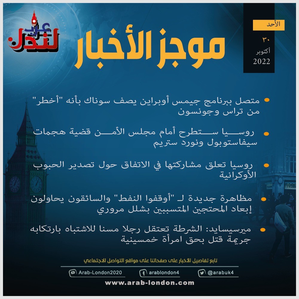 الرئيسية أخبار موجز لأهم أخبار بريطانيا الأحد (30-10-2022) أخبار موجز لأهم أخبار بريطانيا الأحد (30-10-2022) 2022-10-30 السابق بريطانيا… مجموعة من ستة أفراد "فروا من حانة دون دفع فاتورة بقيمة 270 جنيهًا إسترلينيًا" التالي احتفاظ أرباب الأعمال بالبقشيش قد يصبح غير قانوني قريبا تابعوا آخر أخبار عرب لندن عبر Google News الاكثر قراءة الديلي ميل: دبي انتهت والناس يفرون منها !! 2026-03-12 لندن تدرس فرض رسوم إضافية على سيارات الدفع الرباعي للحد من حوادث الطرق 2026-03-13 هل تحولت السياسة الأمريكية إلى حرب صليبية على إيران بقيادة وزير الدفاع الأمريكي؟ 2026-03-12 أمسية حوارية على منصة عرب لندن بعنوان “زلزال قوانين الهجرة البريطانية” 2026-03-14 وفاتان في بريطانيا بمرض التهاب السحايا: ما هو وما أعراضه وكيف تحمي نفسك؟ 2026-03-17 مهندس بريطاني يحوّل طائرة "بوينغ 737" إلى ملجأ نووي في حديقة منزله 2026-03-12 مقالات ذات صلة مراهقان في عداد المفقودين إثر سقوط سيارة في نهر نين 2026-03-18 مساجد بريطانيا تعلن الجمعة أول أيام عيد الفطر 2026-03-18 موجز أخبار بريطانيا من منصة عرب لندن: الأربعاء: 17 مارس/آذار 2026 2026-03-18 كاميرات "بدون فلاش": تكنولوجيا رادارية متطورة لرصد السرعة في لندن 2026-03-18 عاجل| بسبب تبييض جرائم الحرب في السودان.. شبكة "سكاي نيوز" تنهي شراكتها مع الإمارات 2026-03-18
