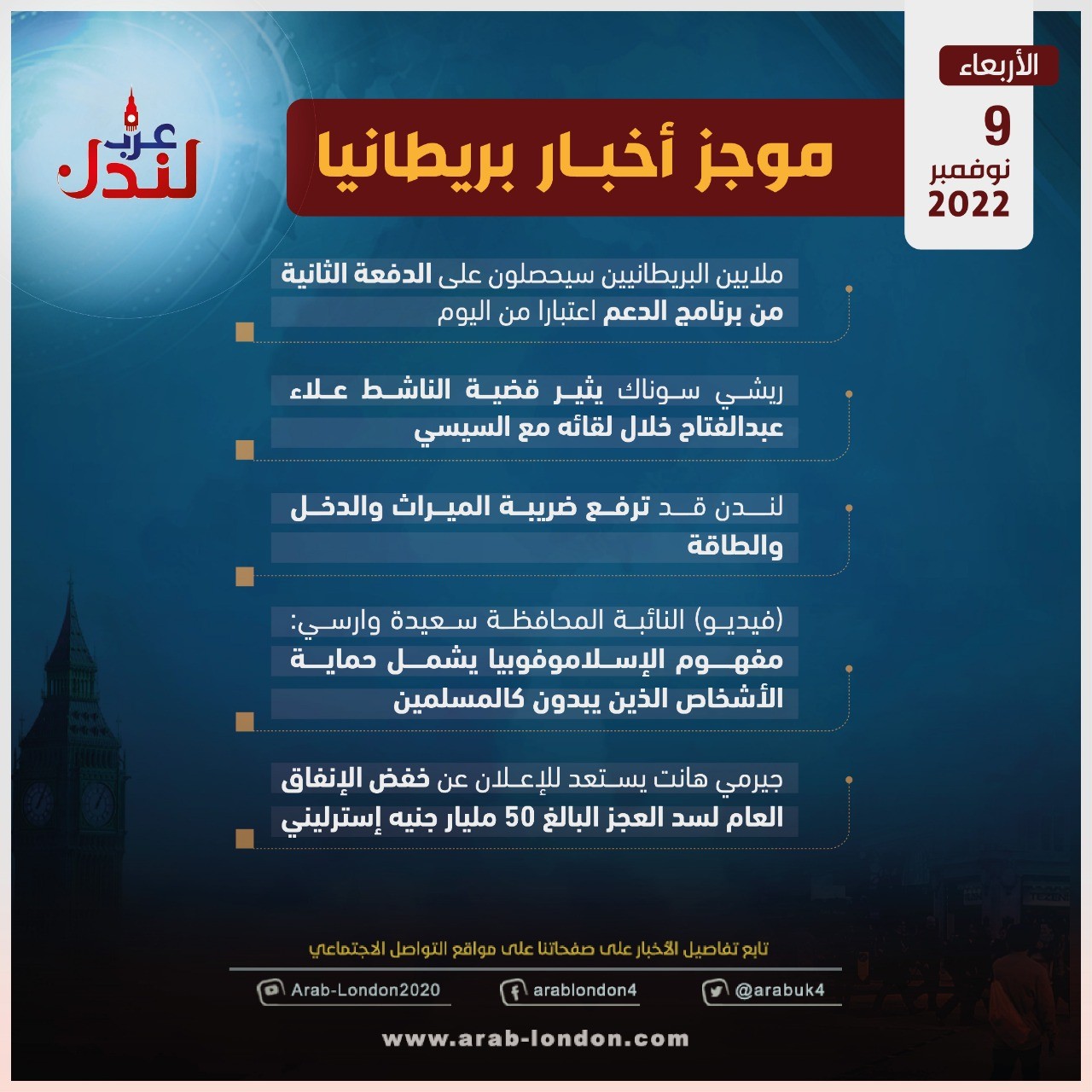 الرئيسية أخبار موجز لأهم أخبار بريطانيا الأربعاء (9-11-2022) أخبار موجز لأهم أخبار بريطانيا الأربعاء (9-11-2022) 2022-11-09 السابق عاجل .. نقل نجمة كرة السلة الأميركية بريتني غرينر إلى مجمع للسجون في روسيا التالي (فيديو) النائبة المحافظة سعيدة وارسي: مفهوم الإسلاموفوبيا يشمل حماية الأشخاص الذين يبدون كالمسلمين تابعوا آخر أخبار عرب لندن عبر Google News الاكثر قراءة الديلي ميل: دبي انتهت والناس يفرون منها !! 2026-03-12 لندن تدرس فرض رسوم إضافية على سيارات الدفع الرباعي للحد من حوادث الطرق 2026-03-13 هل تحولت السياسة الأمريكية إلى حرب صليبية على إيران بقيادة وزير الدفاع الأمريكي؟ 2026-03-12 أمسية حوارية على منصة عرب لندن بعنوان “زلزال قوانين الهجرة البريطانية” 2026-03-14 وفاتان في بريطانيا بمرض التهاب السحايا: ما هو وما أعراضه وكيف تحمي نفسك؟ 2026-03-17 مهندس بريطاني يحوّل طائرة "بوينغ 737" إلى ملجأ نووي في حديقة منزله 2026-03-12 مقالات ذات صلة ستارمر يتهم حزب المحافظين بـوجود "مشكلة مع المسلمين" بعد جدل حول صلاة في ميدان ترافالغار 2026-03-18 ترامب يشن هجومًا جديدًا على ستارمر مع تعثر خطته البحرية لفتح مضيق هرمز 2026-03-18 مراهقان في عداد المفقودين إثر سقوط سيارة في نهر نين 2026-03-18 مساجد بريطانيا تعلن الجمعة أول أيام عيد الفطر 2026-03-18 موجز أخبار بريطانيا من منصة عرب لندن: الأربعاء: 17 مارس/آذار 2026 2026-03-18