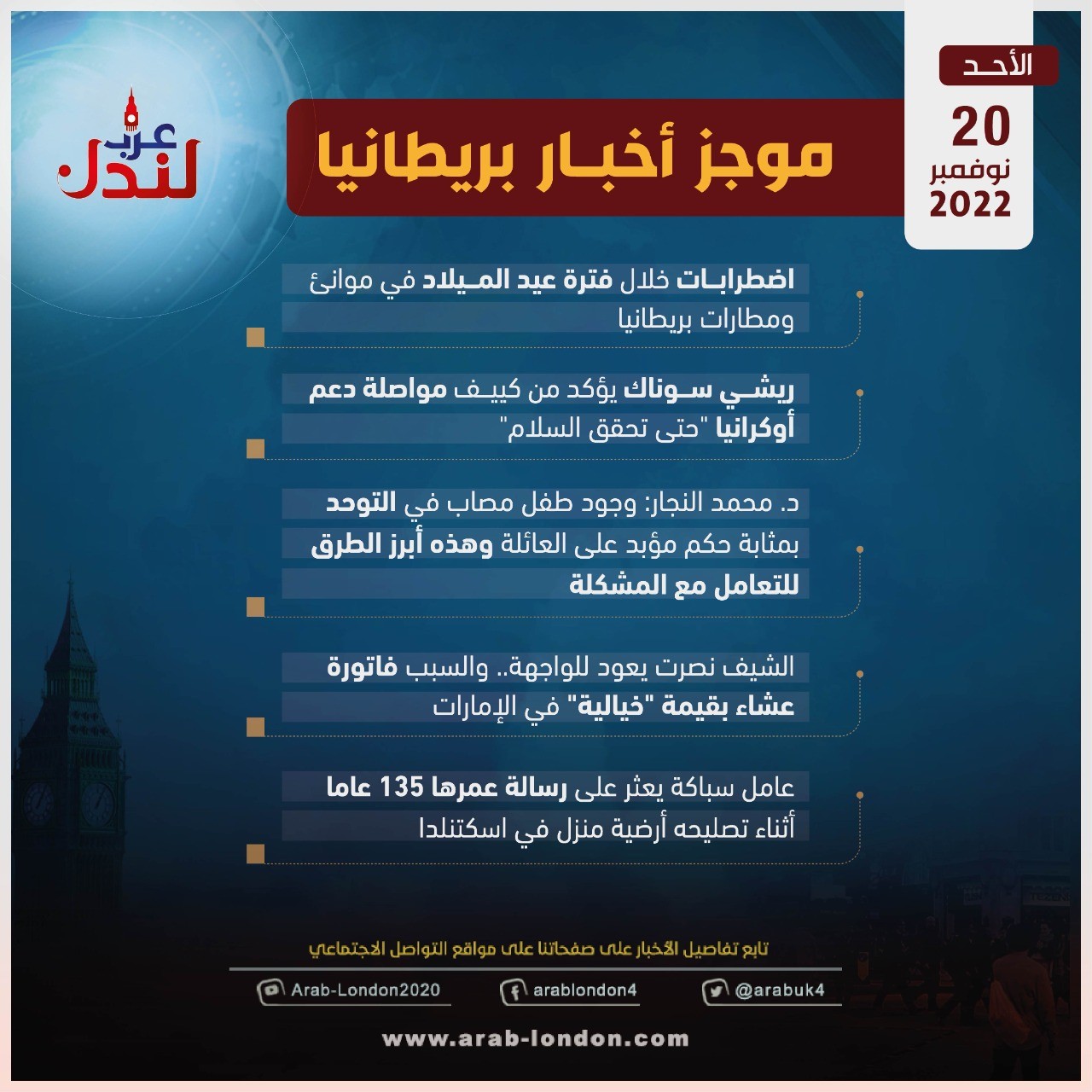 الرئيسية أخبار موجز لأهم أخبار بريطانيا الأحد (20-11-2022) أخبار موجز لأهم أخبار بريطانيا الأحد (20-11-2022) 2022-11-20 السابق 5 قتلى و18 جريحا خلال إطلاق نار في ملهى ليلي للمثليين في كولورادو التالي تحقيق: "تقصير شرطة بريطانيا تسبب في مقتل رنيم عودة ووالدتها خولة سليم"... إليك التفاصيل تابعوا آخر أخبار عرب لندن عبر Google News الاكثر قراءة الديلي ميل: دبي انتهت والناس يفرون منها !! 2026-03-12 لندن تدرس فرض رسوم إضافية على سيارات الدفع الرباعي للحد من حوادث الطرق 2026-03-13 هل تحولت السياسة الأمريكية إلى حرب صليبية على إيران بقيادة وزير الدفاع الأمريكي؟ 2026-03-12 أمسية حوارية على منصة عرب لندن بعنوان “زلزال قوانين الهجرة البريطانية” 2026-03-14 وفاتان في بريطانيا بمرض التهاب السحايا: ما هو وما أعراضه وكيف تحمي نفسك؟ 2026-03-17 مساجد بريطانيا تعلن الجمعة أول أيام عيد الفطر 2026-03-18 مقالات ذات صلة ستارمر: حزب المحافظين يعاني من "مشكلة مع المسلمين" 2026-03-18 ترامب يشن هجومًا جديدًا على ستارمر مع تعثر خطته البحرية لفتح مضيق هرمز 2026-03-18 مراهقان في عداد المفقودين إثر سقوط سيارة في نهر نين 2026-03-18 مساجد بريطانيا تعلن الجمعة أول أيام عيد الفطر 2026-03-18 موجز أخبار بريطانيا من منصة عرب لندن: الأربعاء: 17 مارس/آذار 2026 2026-03-18
