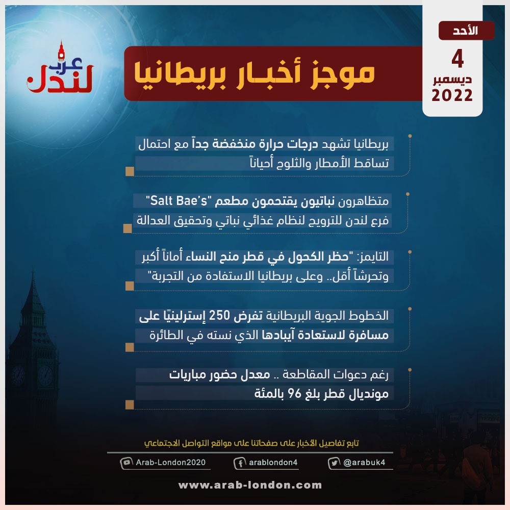الرئيسية أخبار موجز لأهم أخبار بريطانيا: الأحد 4-12-2022 أخبار موجز لأهم أخبار بريطانيا: الأحد 4-12-2022 2022-12-04 السابق التاج الملكي يخضع لعملية تعديل سرية قبيل تتويج الملك تشارلز الثالث التالي بريطانيا تشهد درجات حرارة منخفضة جداً مع احتمال تساقط الأمطار والثلوج أحياناً تابعوا آخر أخبار عرب لندن عبر Google News الاكثر قراءة الديلي ميل: دبي انتهت والناس يفرون منها !! 2026-03-12 مساجد بريطانيا تعلن الجمعة أول أيام عيد الفطر 2026-03-18 لندن تدرس فرض رسوم إضافية على سيارات الدفع الرباعي للحد من حوادث الطرق 2026-03-13 هل تحولت السياسة الأمريكية إلى حرب صليبية على إيران بقيادة وزير الدفاع الأمريكي؟ 2026-03-12 أمسية حوارية على منصة عرب لندن بعنوان “زلزال قوانين الهجرة البريطانية” 2026-03-14 وفاتان في بريطانيا بمرض التهاب السحايا: ما هو وما أعراضه وكيف تحمي نفسك؟ 2026-03-17 مقالات ذات صلة ستارمر: حزب المحافظين يعاني من "مشكلة مع المسلمين" 2026-03-18 ترامب يشن هجومًا جديدًا على ستارمر مع تعثر خطته البحرية لفتح مضيق هرمز 2026-03-18 مراهقان في عداد المفقودين إثر سقوط سيارة في نهر نين 2026-03-18 مساجد بريطانيا تعلن الجمعة أول أيام عيد الفطر 2026-03-18 موجز أخبار بريطانيا من منصة عرب لندن: الأربعاء: 17 مارس/آذار 2026 2026-03-18