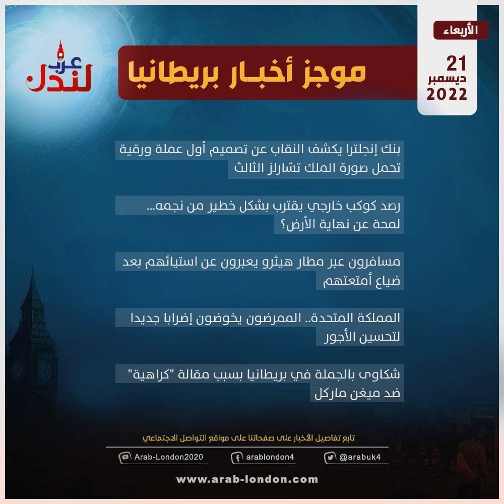 الرئيسية أخبار موجز أخبار بريطانيا الأربعاء: 21 كانون الأول 2022 أخبار موجز أخبار بريطانيا الأربعاء: 21 كانون الأول 2022 2022-12-21 السابق تيك توك يواجه أزمة وجود مع تزايد حظره في الولايات المتحدة التالي شرطة بريطانيا تحقق بشأن انتهاكات عنصرية من قبل برلماني بريطاني ضد ناشط حقوقي بحريني تابعوا آخر أخبار عرب لندن عبر Google News الاكثر قراءة الديلي ميل: دبي انتهت والناس يفرون منها !! 2026-03-12 مساجد بريطانيا تعلن الجمعة أول أيام عيد الفطر 2026-03-18 لندن تدرس فرض رسوم إضافية على سيارات الدفع الرباعي للحد من حوادث الطرق 2026-03-13 هل تحولت السياسة الأمريكية إلى حرب صليبية على إيران بقيادة وزير الدفاع الأمريكي؟ 2026-03-12 أمسية حوارية على منصة عرب لندن بعنوان “زلزال قوانين الهجرة البريطانية” 2026-03-14 وفاتان في بريطانيا بمرض التهاب السحايا: ما هو وما أعراضه وكيف تحمي نفسك؟ 2026-03-17 مقالات ذات صلة ستارمر: حزب المحافظين يعاني من "مشكلة مع المسلمين" 2026-03-18 ترامب يشن هجومًا جديدًا على ستارمر مع تعثر خطته البحرية لفتح مضيق هرمز 2026-03-18 مراهقان في عداد المفقودين إثر سقوط سيارة في نهر نين 2026-03-18 مساجد بريطانيا تعلن الجمعة أول أيام عيد الفطر 2026-03-18 موجز أخبار بريطانيا من منصة عرب لندن: الأربعاء: 17 مارس/آذار 2026 2026-03-18